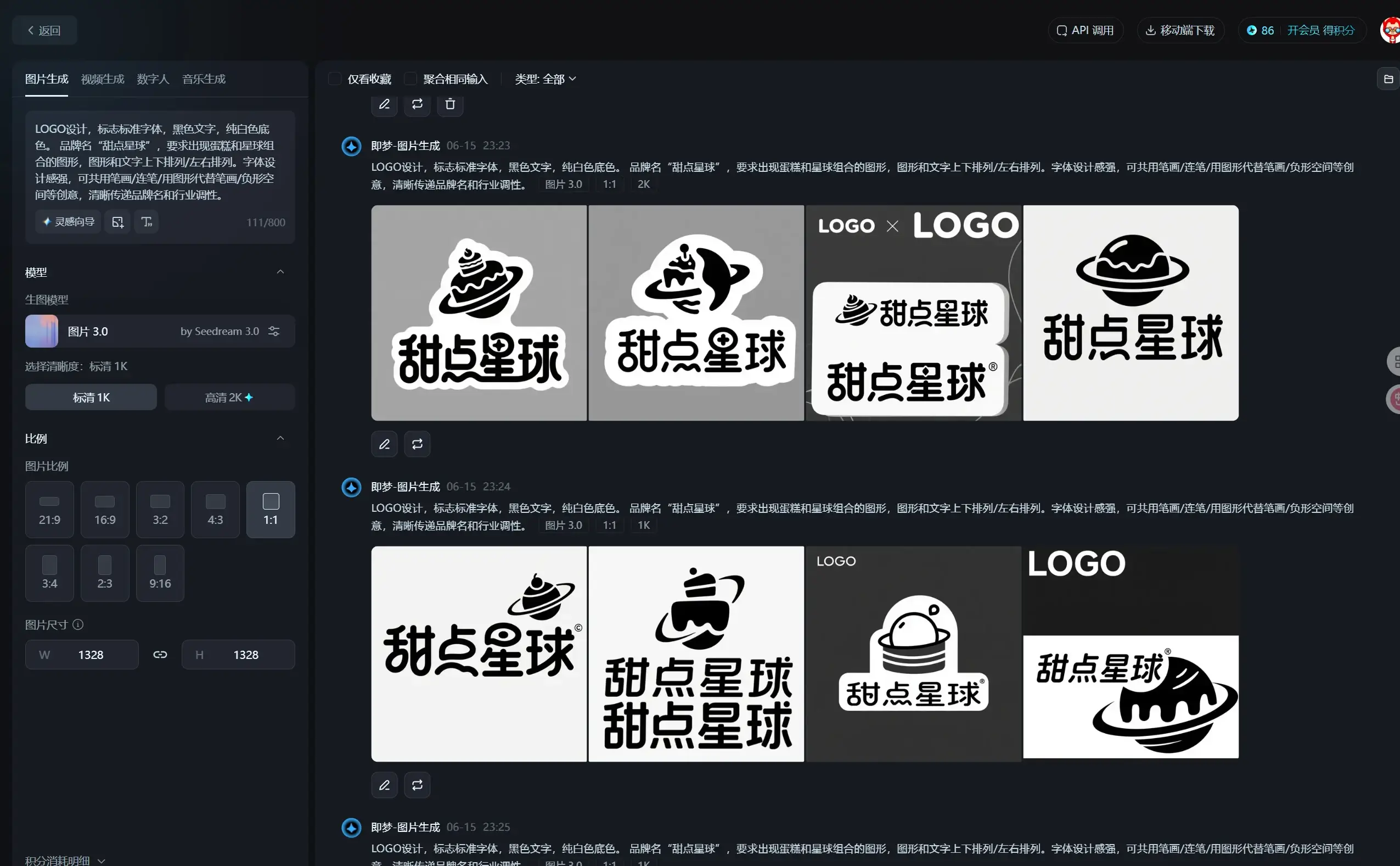 品牌名“甜点星球”,要求出现蛋糕和星球组合的图形,图形和文字上下排列/左右排列。字体设计感强,可共用笔画/连笔/用图形代替笔画/负形空间等创意,清晰传递品牌名和行业调性。