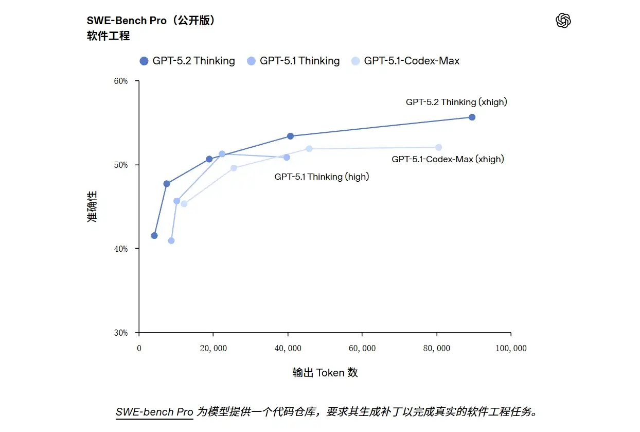 GPT‑5.2 Thinking 在 SWE-bench Pro 测试取得了 55.6% 的新成绩。SWE-bench Pro 是一项严格评估真实软件工程能力的基准测试。