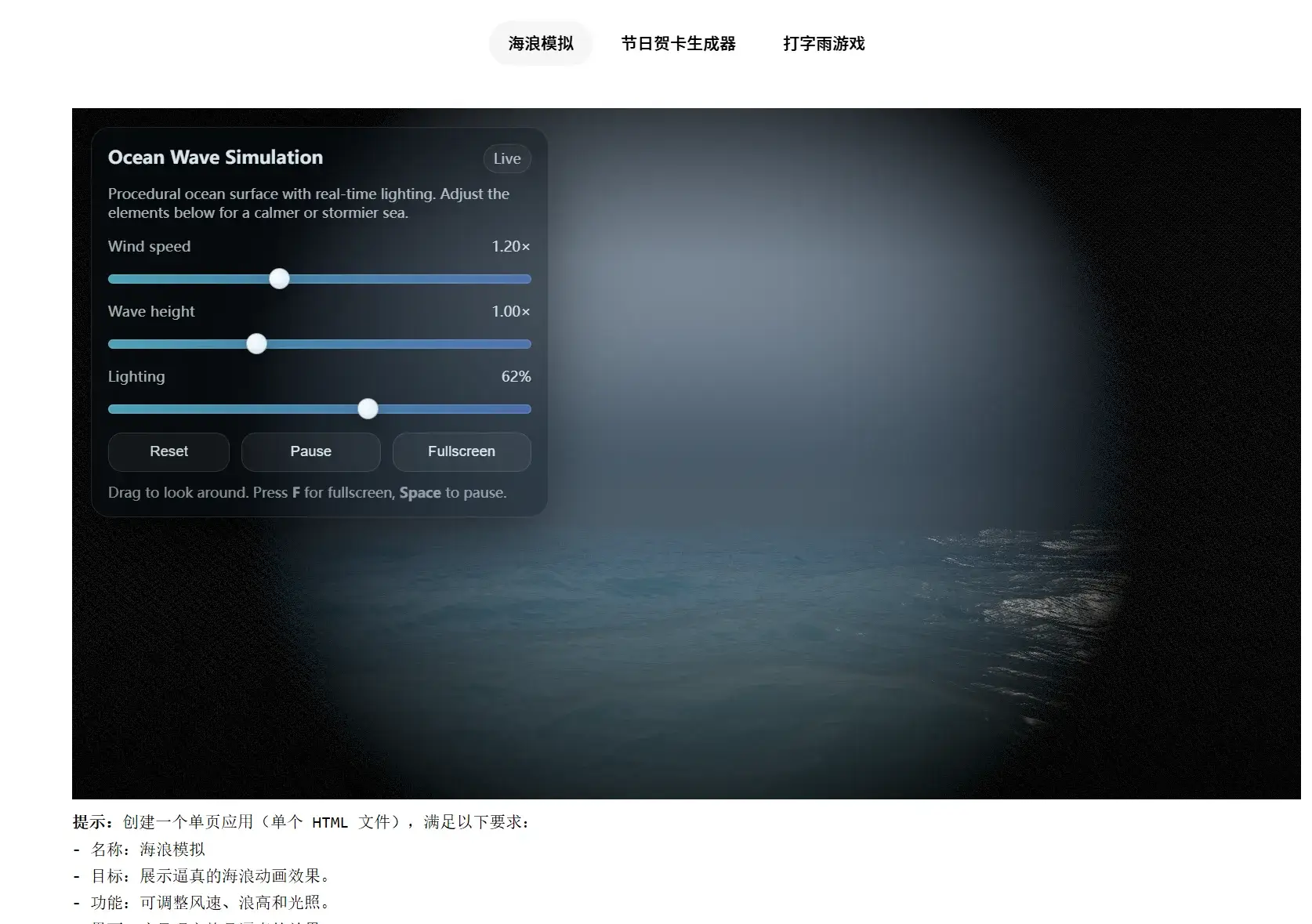 下图是用GPT‑5.2 Thinking生成的海浪模拟器前端工程,足以代表了自 GPT-5 以来在智能体编码上的最大飞跃。