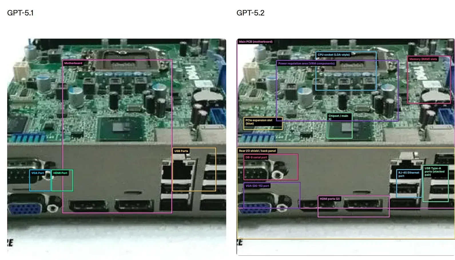 视觉理解能力也大幅提升,图表/GUI 理解错误率降低 38%,支持图像感知、空间推理和跨模态任务。如下图中所示:GPT-5.2能准确标记出更多主板上的元件