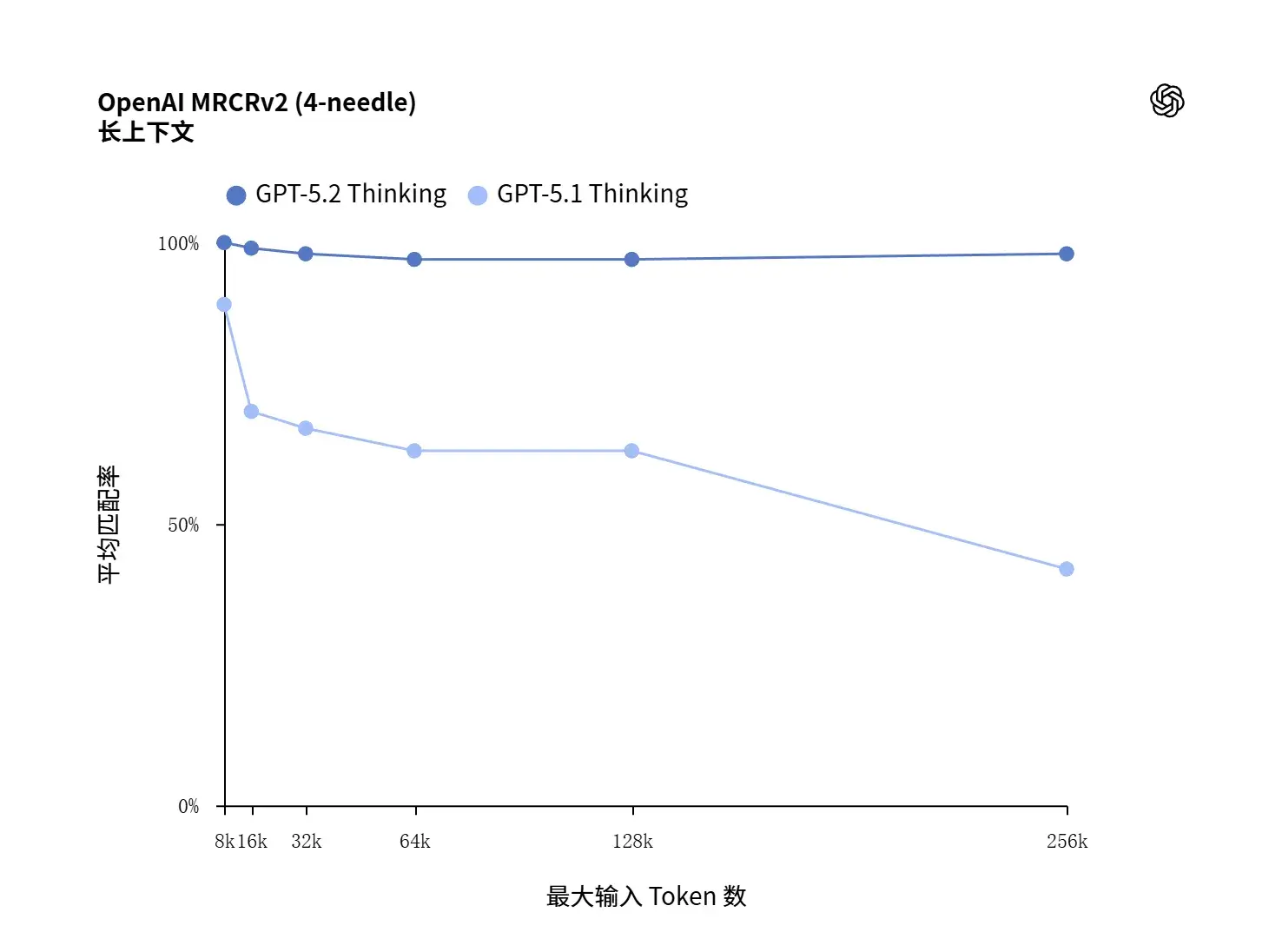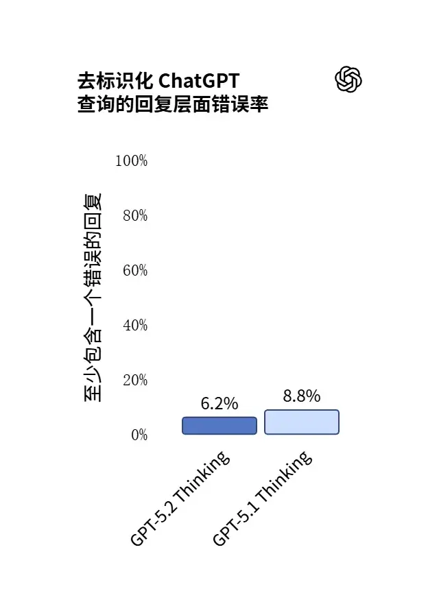 幻觉减少与可靠性提升:在一组去标识化的查询测试中,GPT-5.2 Thinking包含错误回答的情况相比GPT-5.1减少了30%,这在专业研究和决策支持中至关重要。