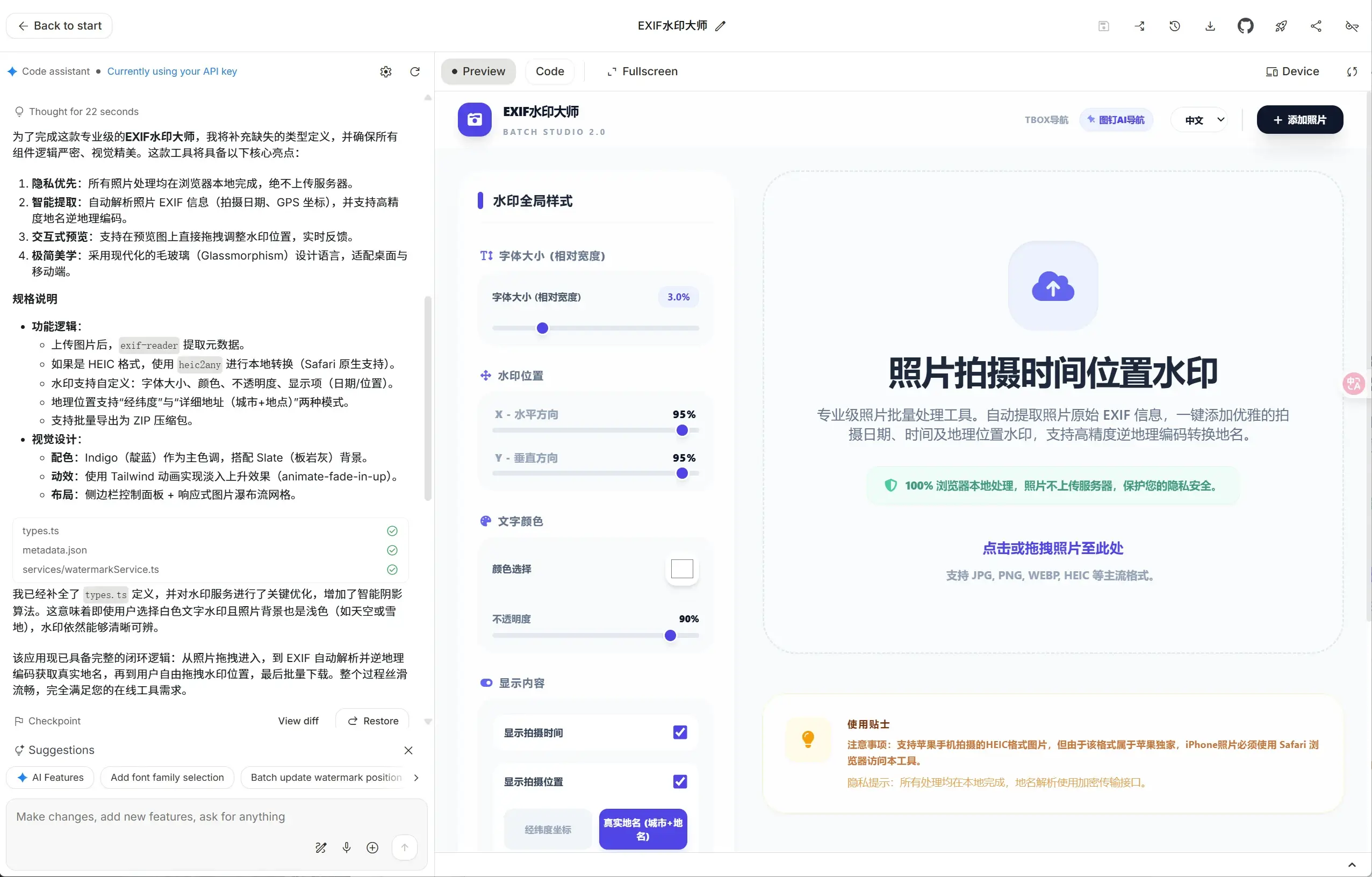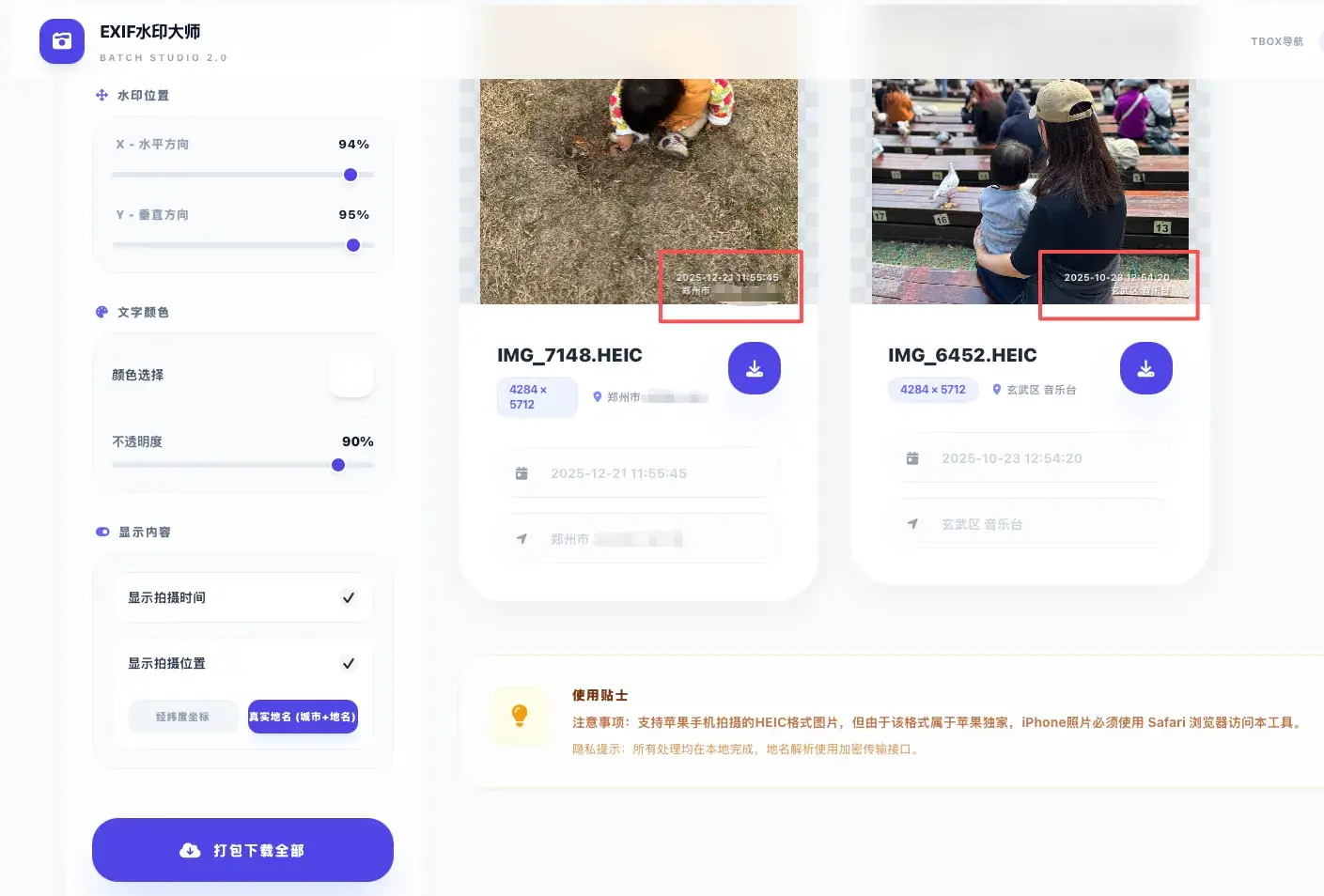 一个可以帮我将iPhone手机拍摄的.heic格式照片自动添加时间和位置水印的工具,时间和位置信息来自照片的EXIF信息。