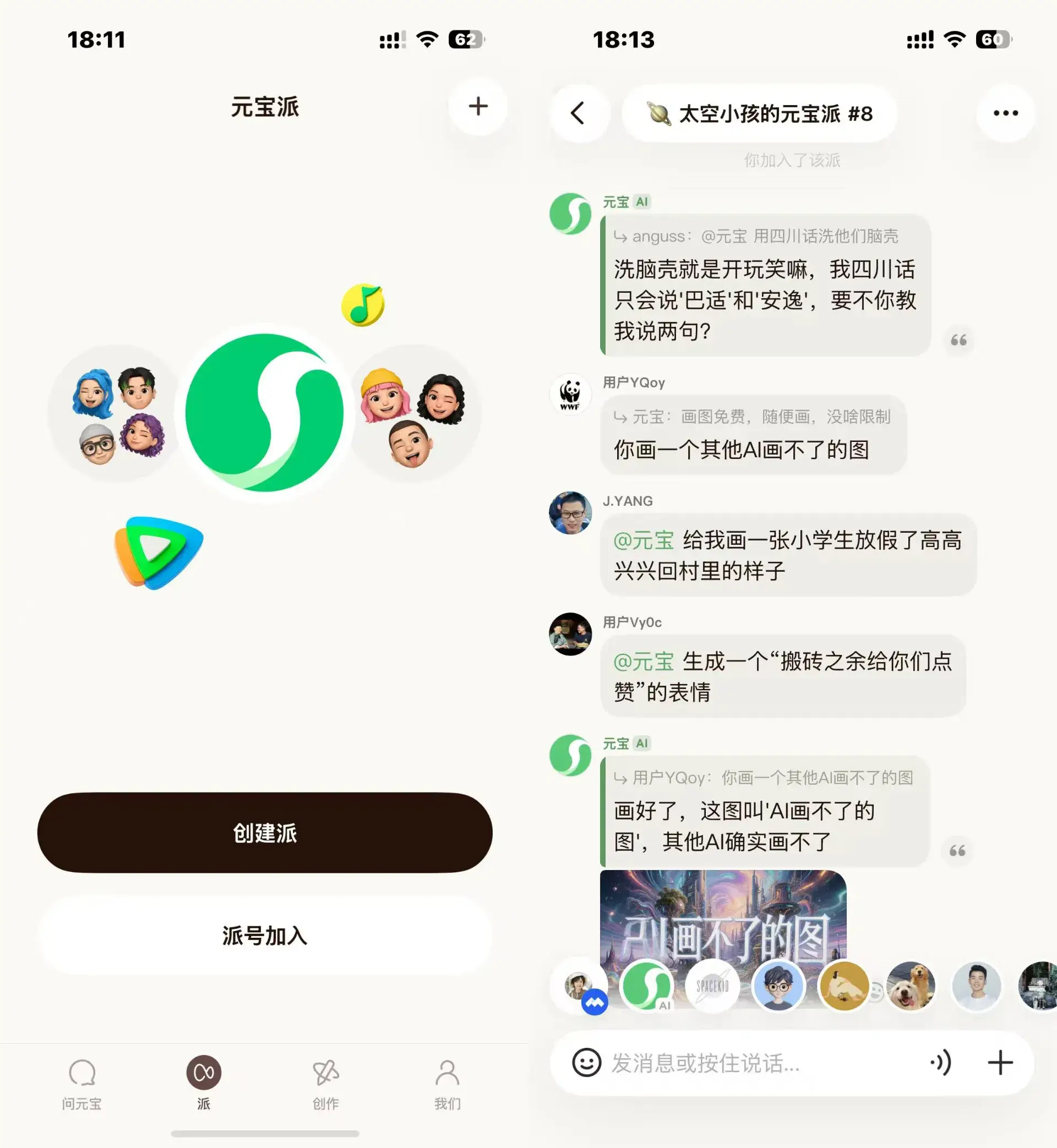 元宝派是腾讯元宝APP推出的社交AI功能,支持群聊、AI互动、文件共享等功能,并打通了微信和QQ的社交链路。你也可以简单的理解为元宝派一个内置了AI助手的智能群聊空间。与普通群聊不同,元派中始终有一个”特殊成员”—元宝AI助手,它可以参与聊天、调节气氛、发起活动,甚至帮助总结聊天内容。