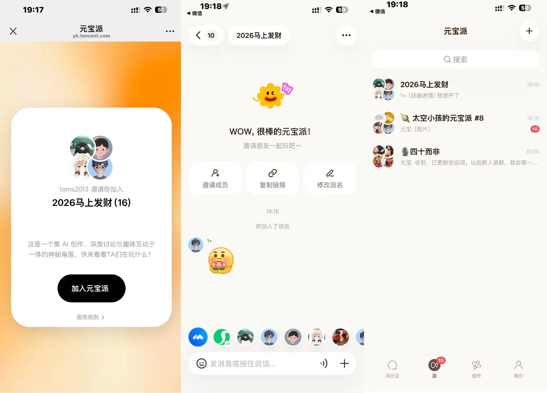 一月26号腾讯元宝宣布10亿元的春节现金红包活动!并推出了全新功能”元宝派“功能,开启了AI社交的新篇章,目前元宝派还在灰度内测中,如果你没有收到邀请,请继续往下看!