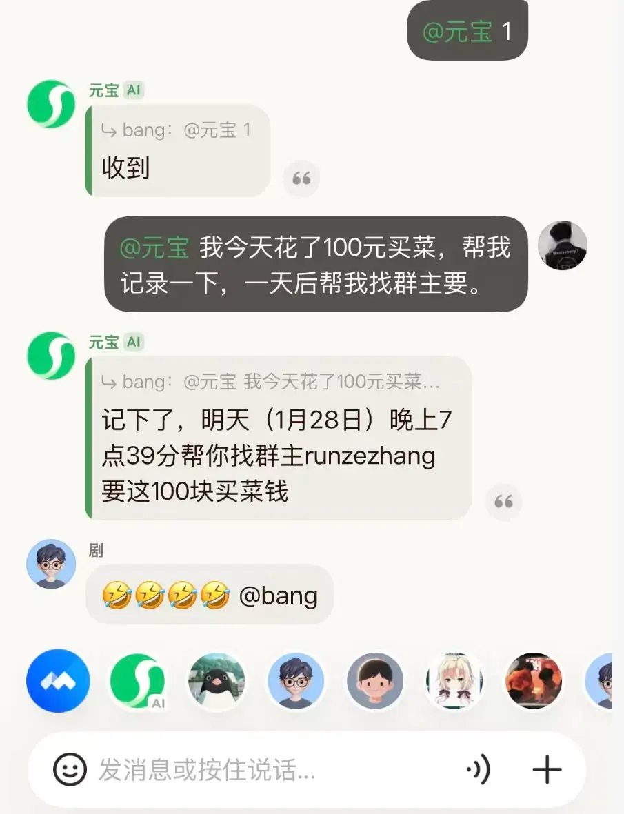 4,加入元宝派,@元宝 ,调戏它吧!!!开启AI社交时代吧~