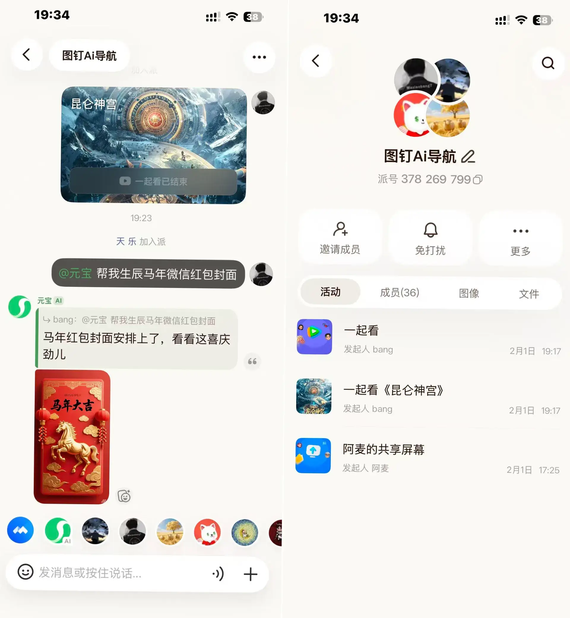 元宝派是腾讯元宝APP推出的社交AI功能,支持群聊、AI互动、文件共享等功能,并打通了微信和QQ的社交链路。你也可以简单的理解为元宝派一个内置了AI助手的智能群聊空间。