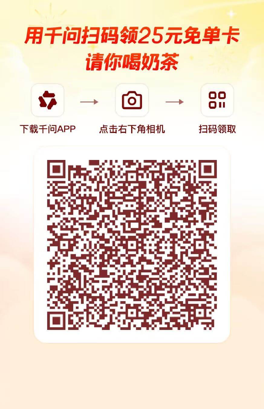 领取方法也非常简单,下载千问APP,登录账号,扫描你朋友的邀请码,或者扫描下面的二维码。因为这样你和你的朋友就可以多领取一张免单卡。