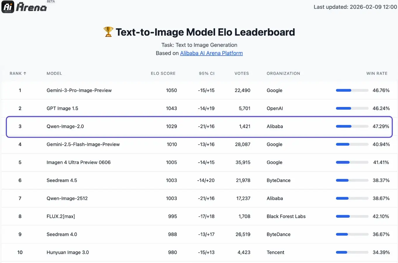 Qwen-Image-2.0 的升级能力得到了重大突破,支持1K token的超长文字输入和2K高分辨率,可准确渲染复杂指令。在AI Arena文生图评测中斩获1029分,位列全球第三,在图片编辑中得分1034,仅次于Nano Banana Pro。
