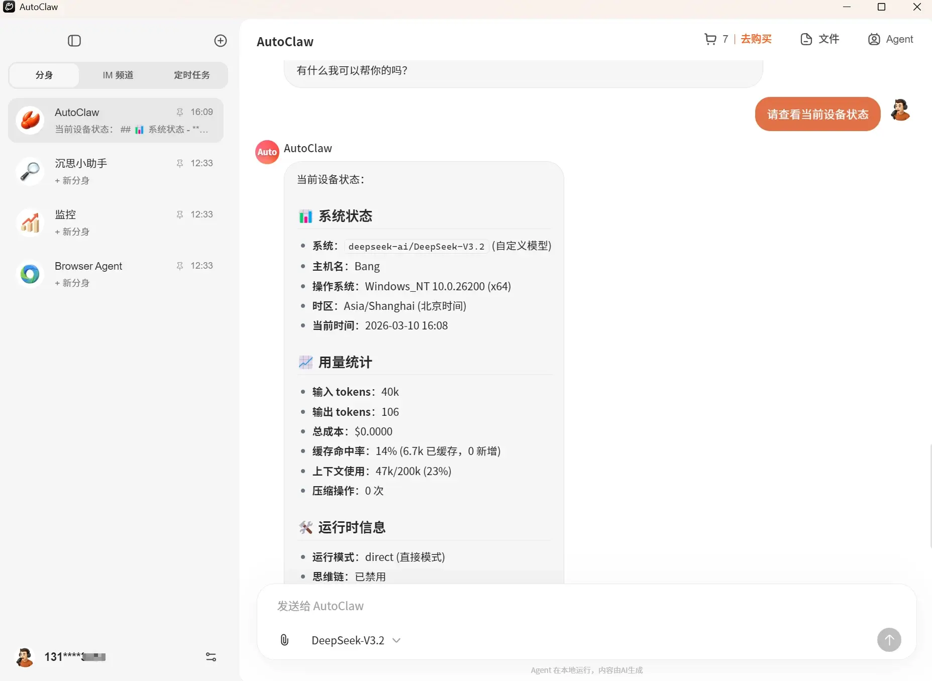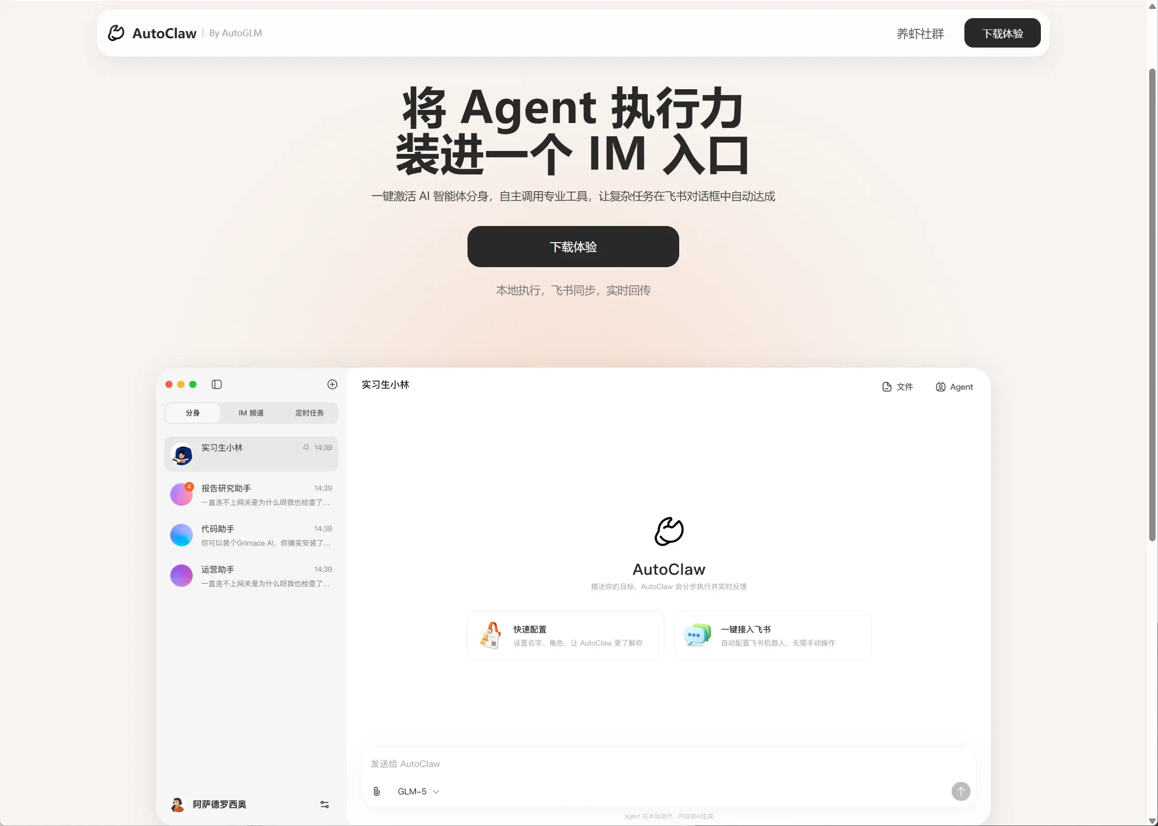 AutoClaw 是一个部署在本地的 Agent ,可以自主调用专业工具,为用户执行复杂任务,并且可以通过在飞书对话框中来为它下达指令和反馈结果。