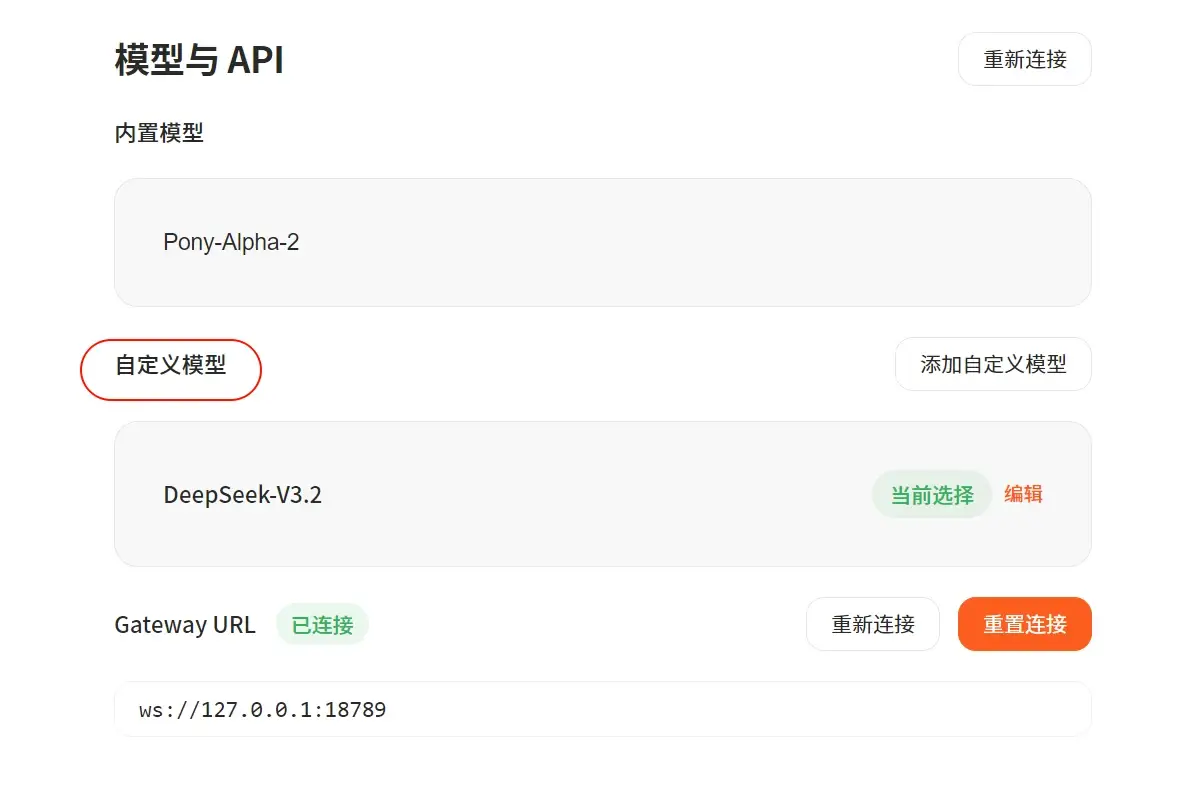 支持填写自定义模型,我用的是硅基流动家的DeepSeek-V3.2 模型来跑的。自定义模型,不需要开积分,硅基能薅代金券。