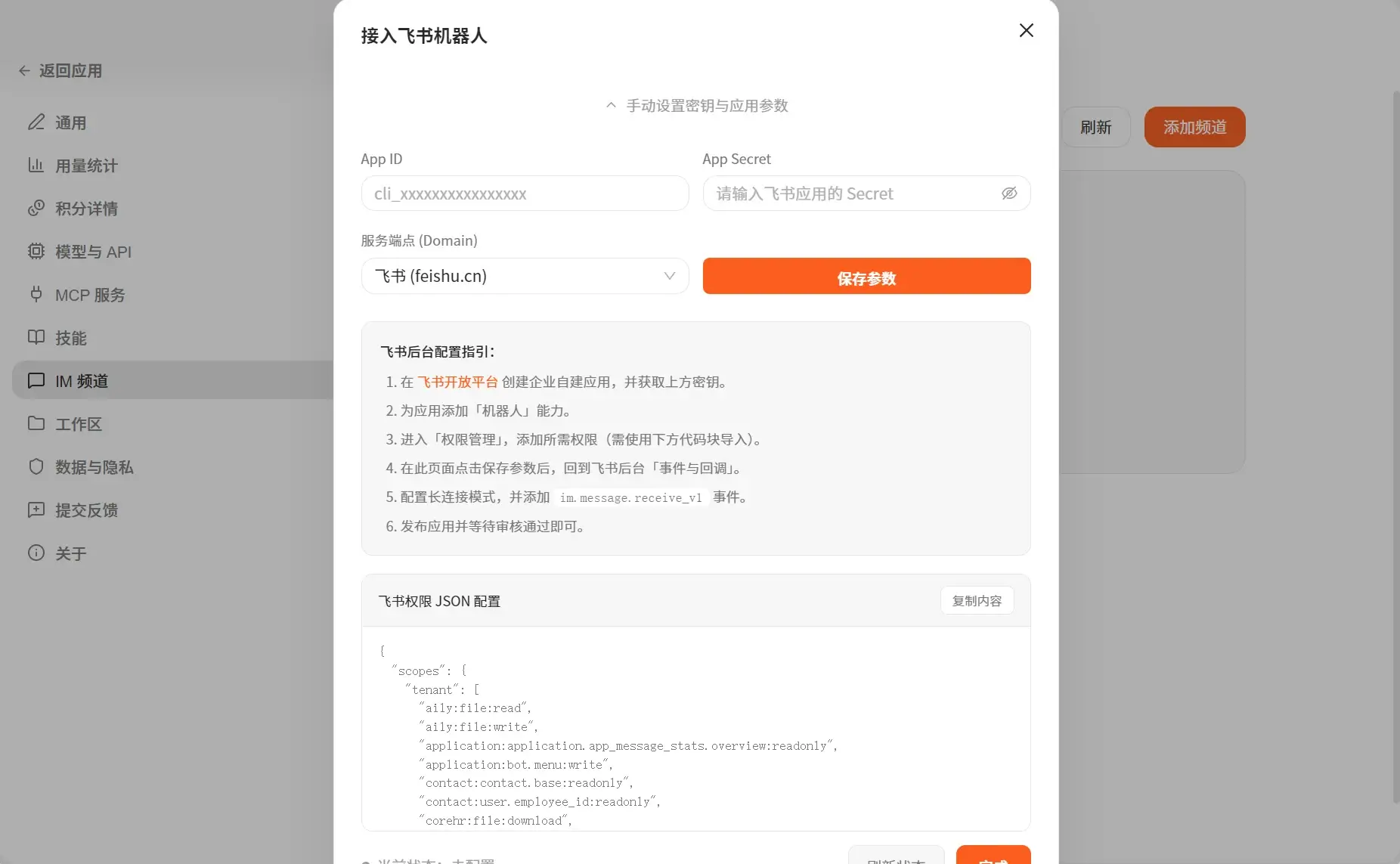AutoClaw 可以对接飞书,用飞书机器人来下达指令。他接入飞书的流程也简化了很多,只需要6步就能轻松接入飞书,而且提供详细的飞书后台配置指引。