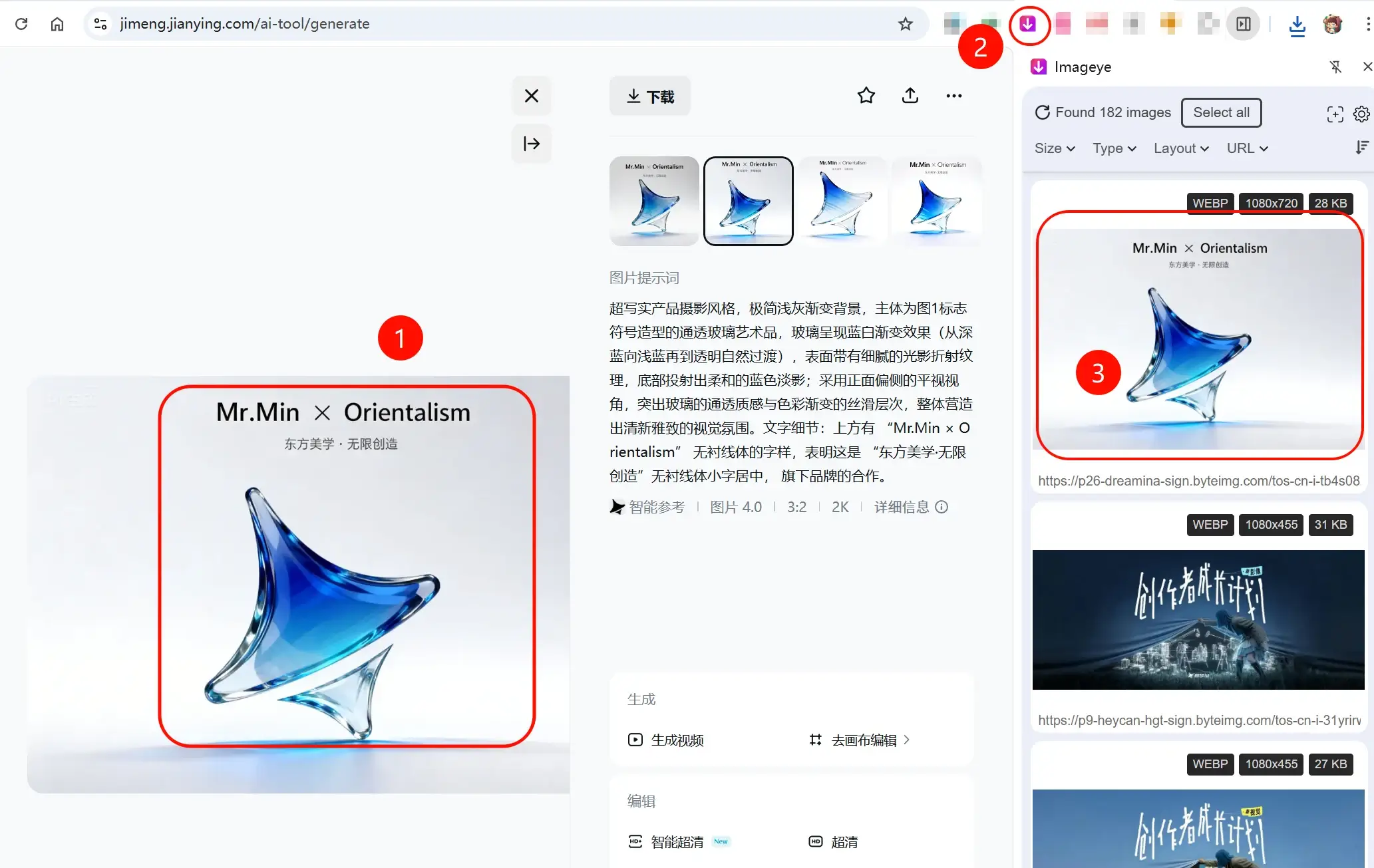 通过Imageye插件 就可以下载到无品牌水印的即梦AI图片,还支持多种格式、PNG、webp、jpg等。