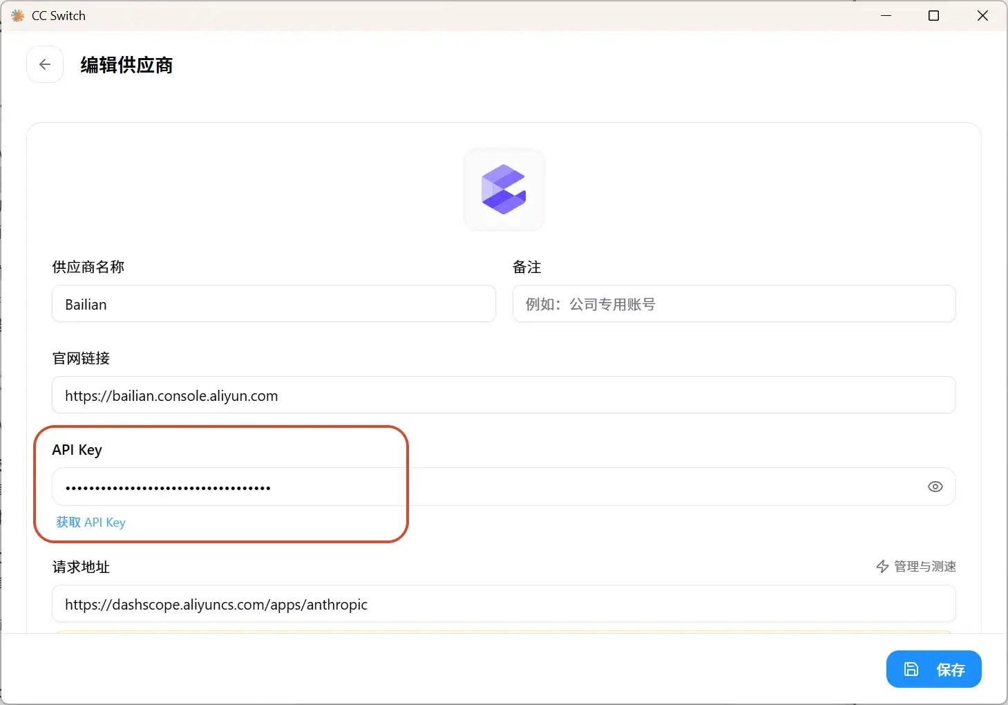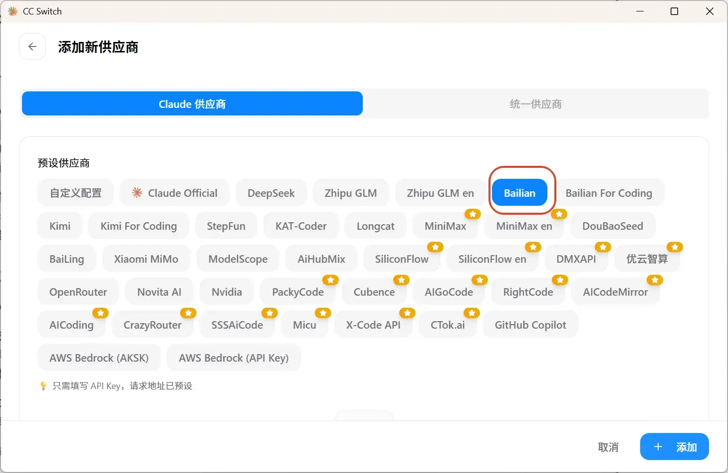 1,打开CC Switch,点击右上角的”+“号 ,添加供应商,选择Bailian – 添加