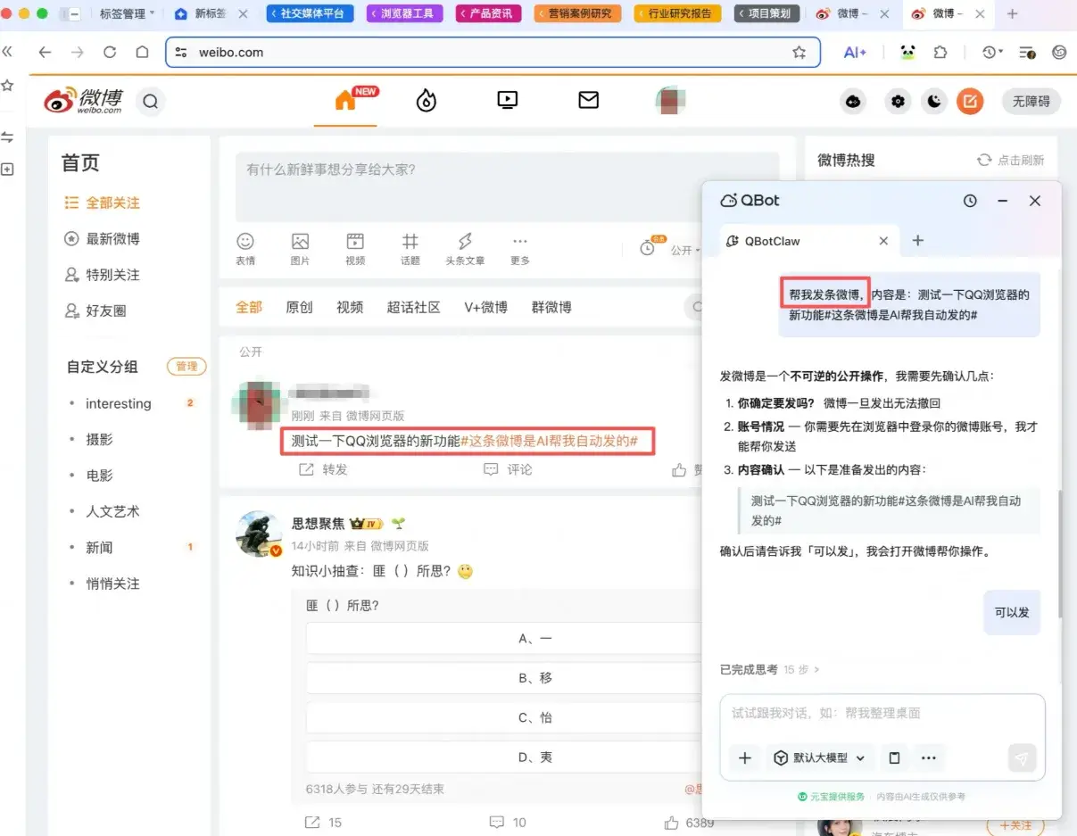其次,它能“记住”上下文。 你在浏览器里登了什么账号、收藏了什么网页、打开了什么文件,它心里都有数,不用每次都从头交代一遍。比如你说“把当前打开的文档内容发条微博”,它直接就知道文档在哪儿、微博账号是哪个,一气呵成。