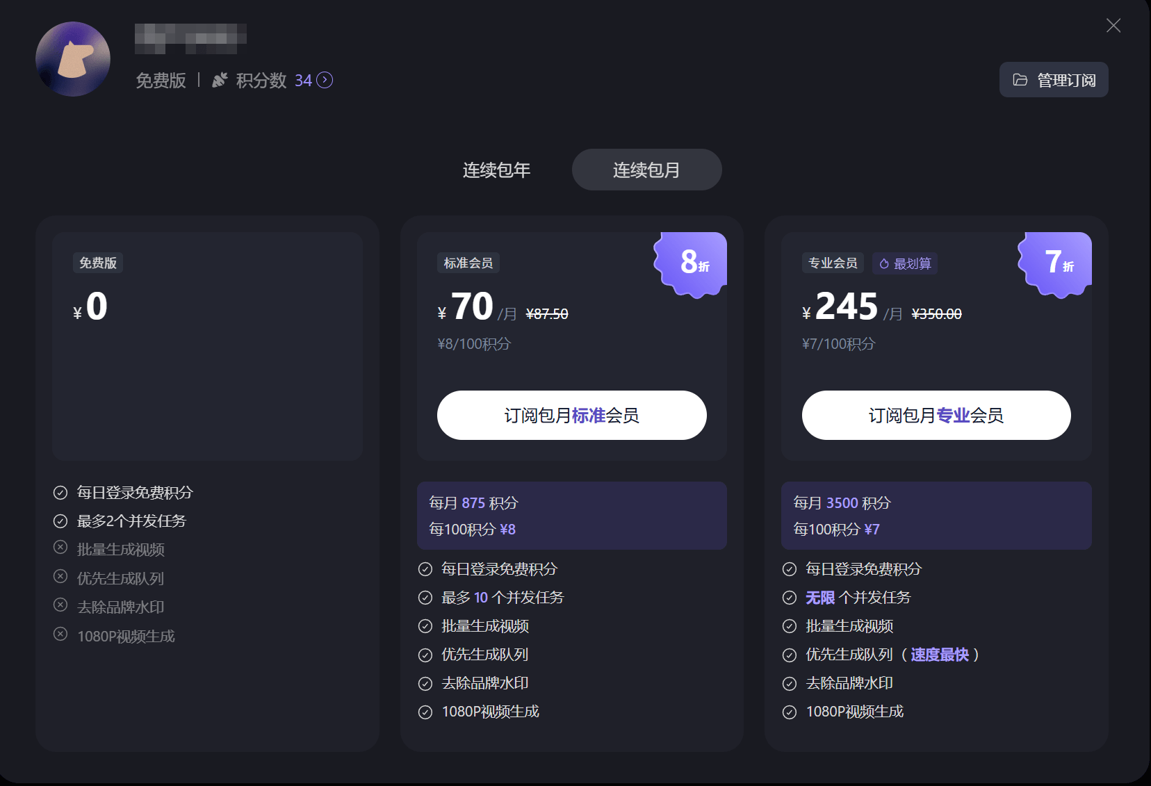 官网的目前标准价格是70元/月,每月送875积分,后续每100积分8元。生成每5秒的720P视频大约需要32积分。每秒视频生成大约需要0.44元左右。