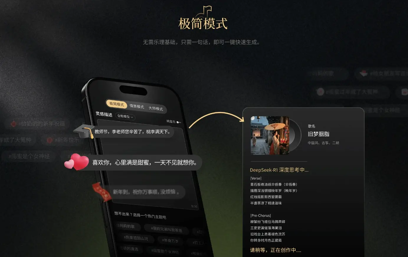 输入歌曲主题、风格或者歌词提示,AI 自动生成完整音乐作品。