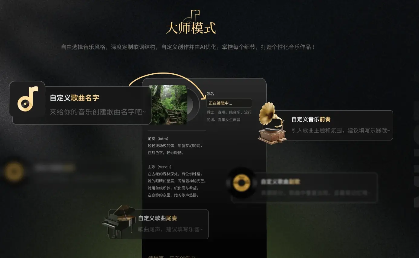 支持根据你的提示生成歌词,再自动匹配旋律与编曲。