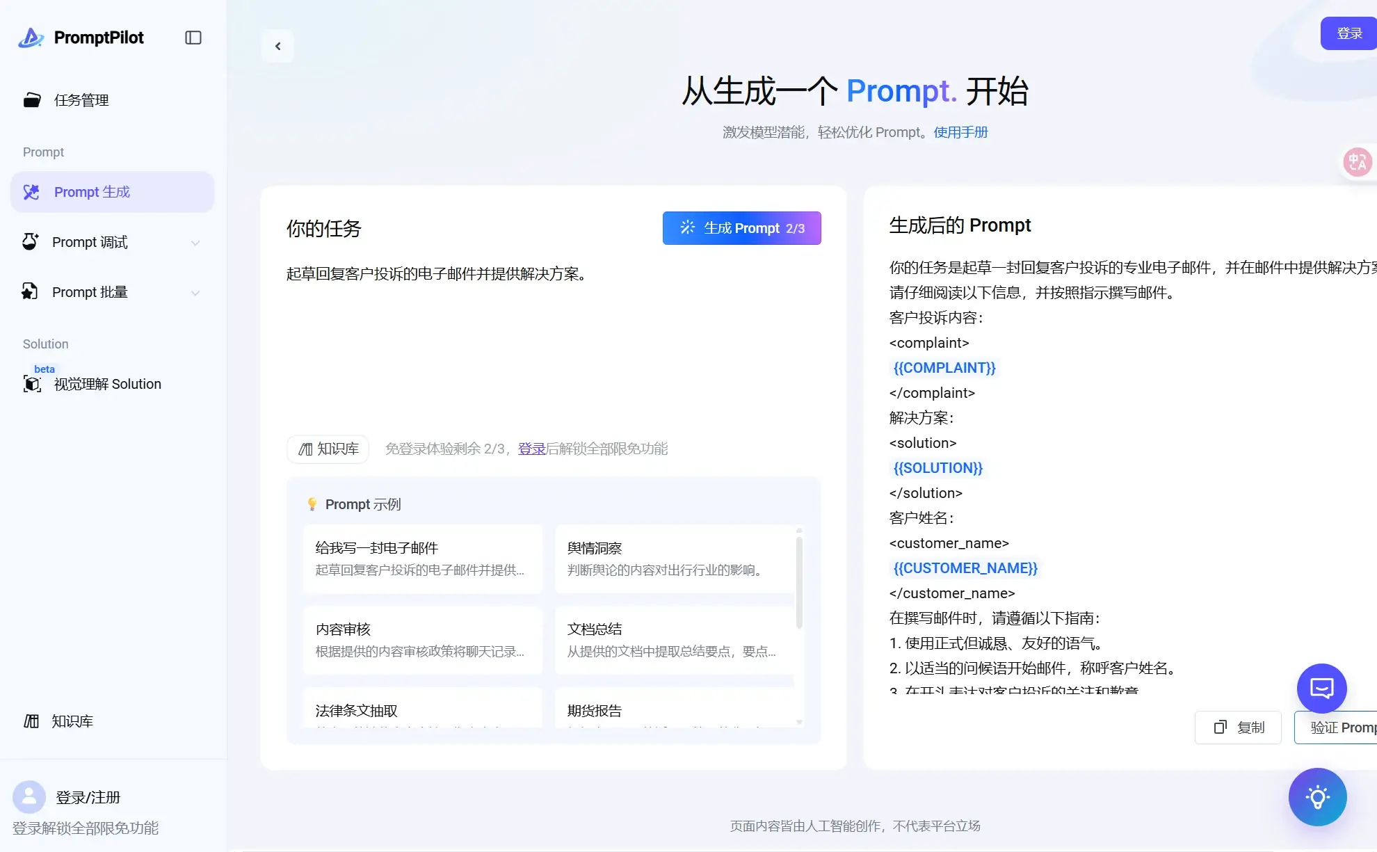 PromptPilot是由字节跳动旗下火山引擎开发的智能提示词(Prompt)优化平台,于2025年6月正式发布。