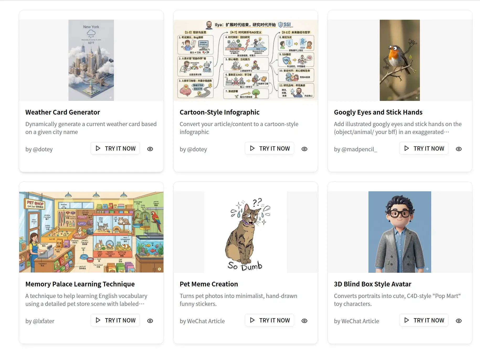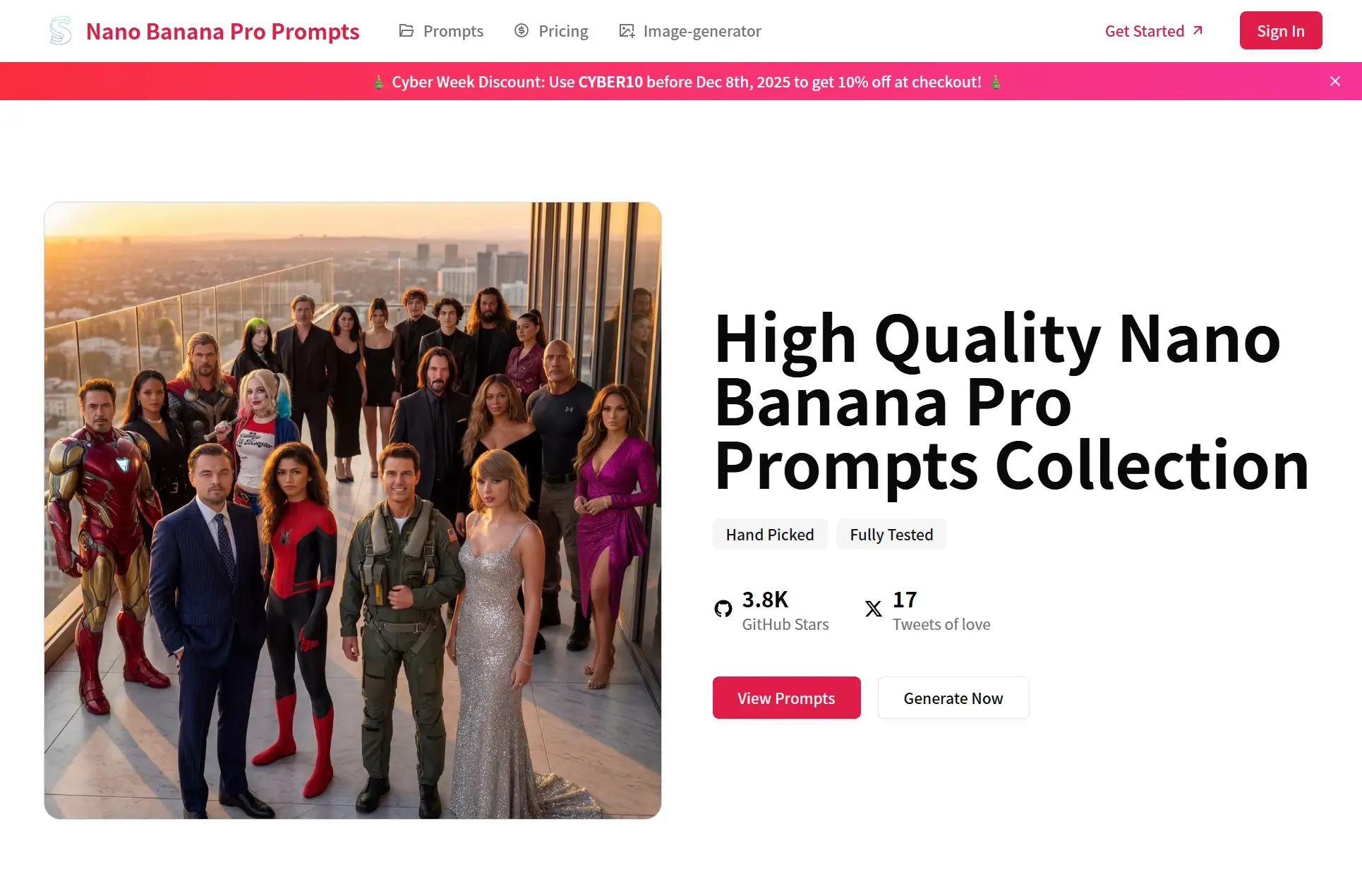它为用户提供经过筛选的高质量提示词库,也嵌入了可直接调用的图像生成器、参考图集和社区资源,帮助创作者快速产出适配 Nano Banana Pro 的高保真图片与信息图。