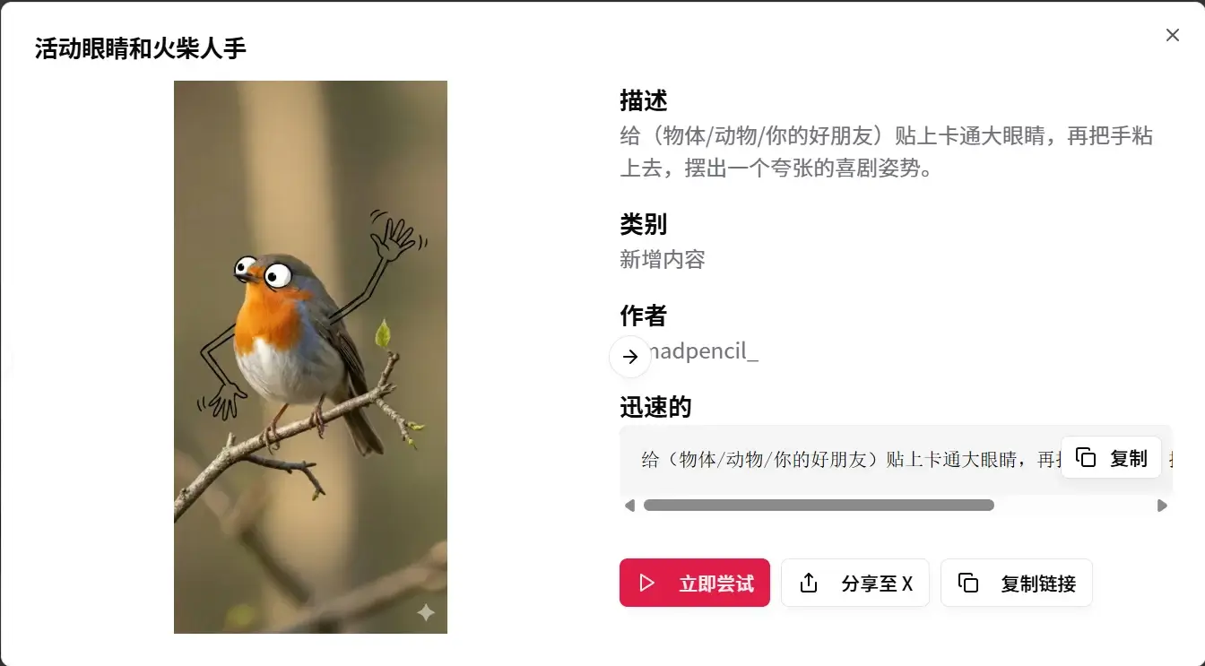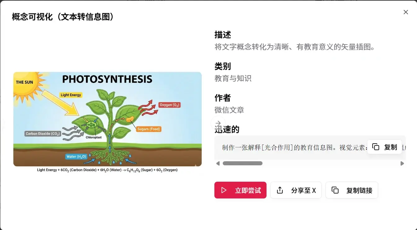 提示词库:按用途/风格/场景分类的海量可复用提示词模板(人物、产品摄影、信息图、插画、漫画等),支持直接复制与参数化。