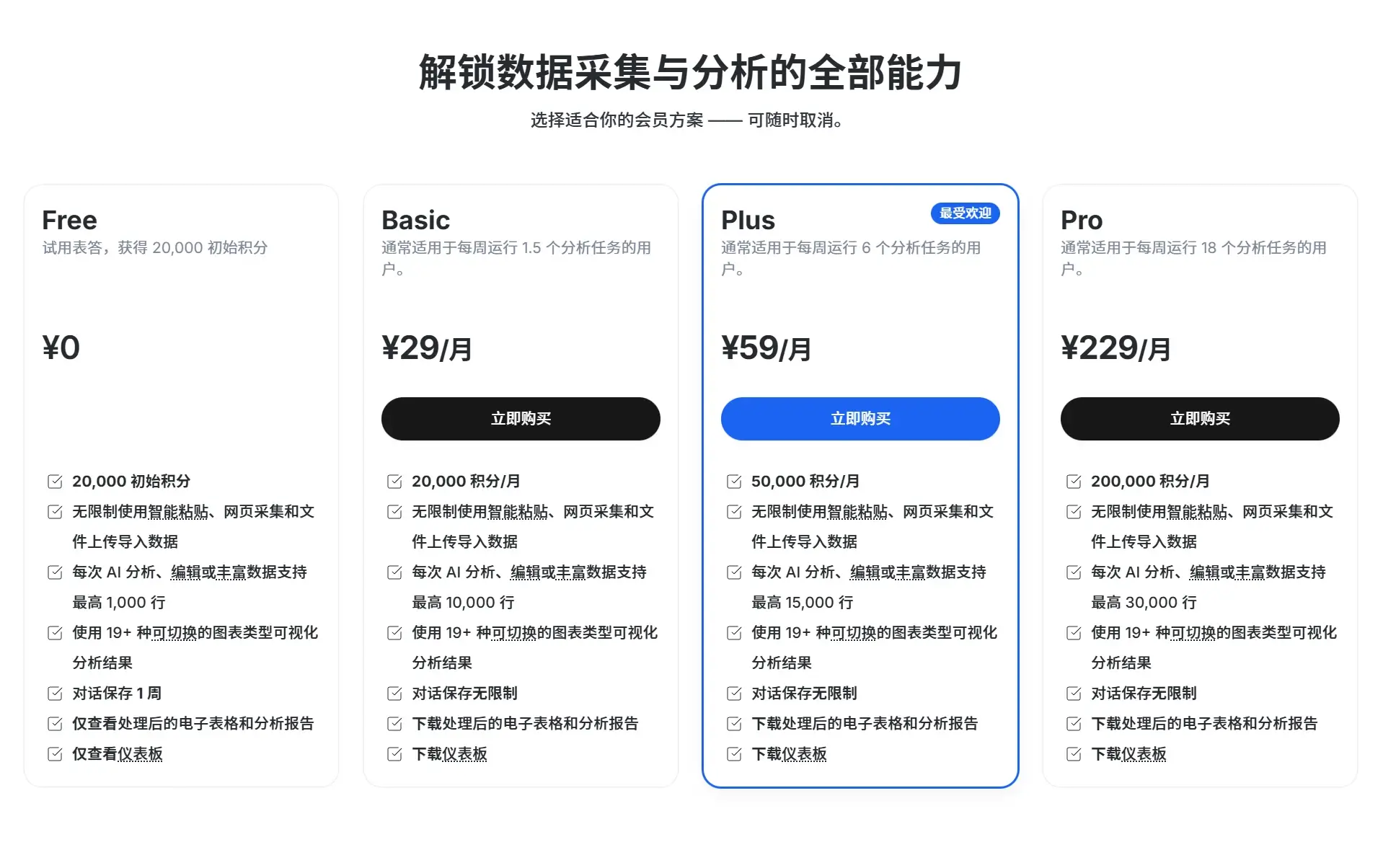 表答提供免费版本供体验,并有增值付费计划(“免费 + ¥29/月 起”),具体套餐、流量/抓取配额与企业定制价格建议以官网或产品内计费页面为准。