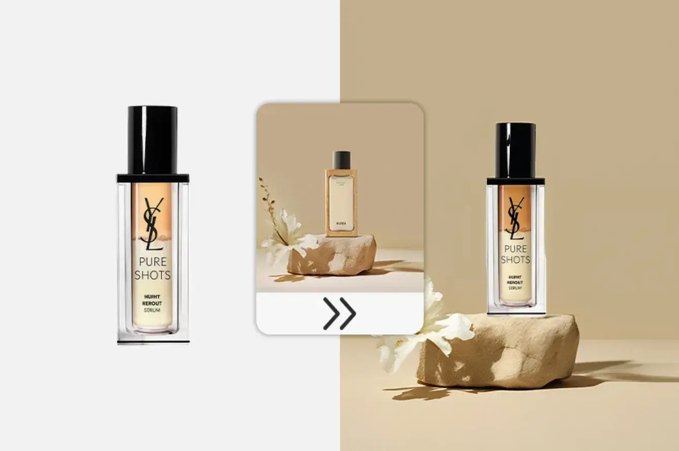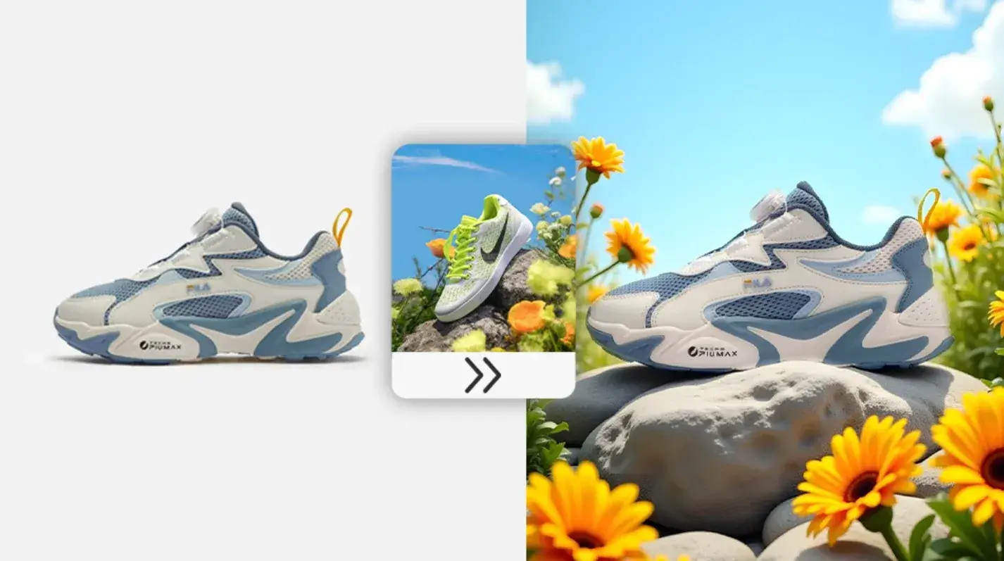 输入商品图+背景图,AI快速实现场景融合,无需复杂布景与拍摄,避免权问题,降低成本并加速产品上市。