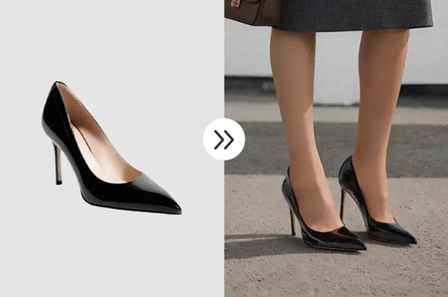 输入鞋靴图 + 模特图,AI自动识别脚部位置,生成局部特写或全身展示图。真实还原鞋面材质、鞋底纹理、光影反射,支持运动鞋、高跟鞋、靴子等全品类,提升消费者“上脚感”。