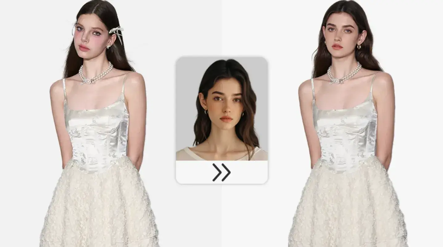 一键替换模特面部,生成不同风格人脸(如通勤、甜美、酷飒等),避免人模特肖像权问题,同时保护隐私,适用于敏感品类或品牌IP形象统一。