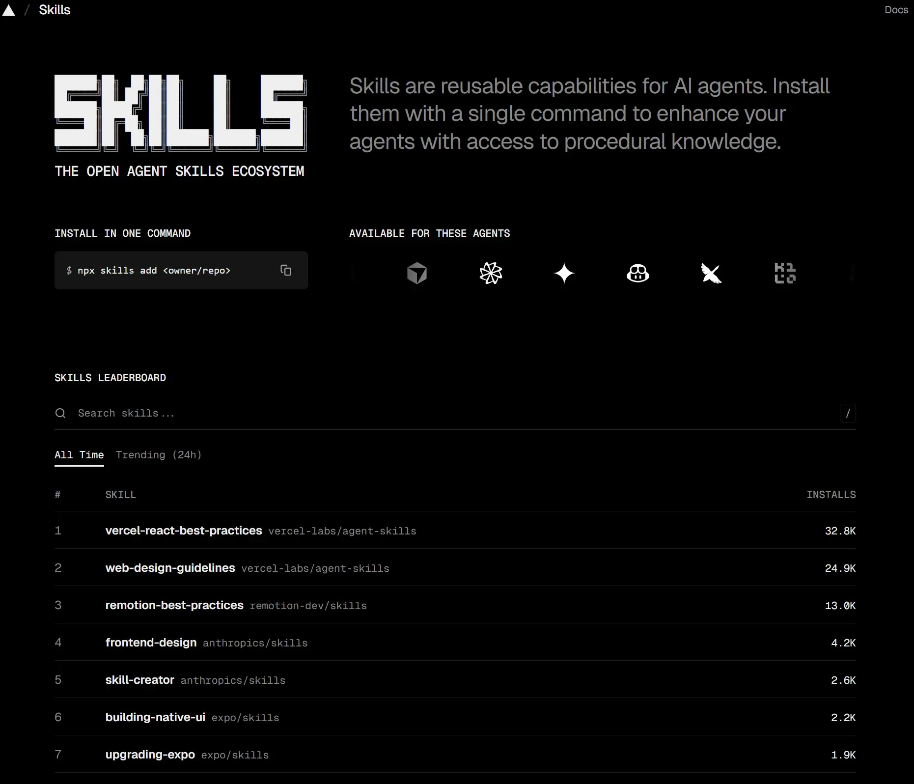 skills.sh 是一个“skills 商店+ 排行榜。该网站收录了2800+个skills (AI技能包),并根据安装量它这些skills进行了排行显示。