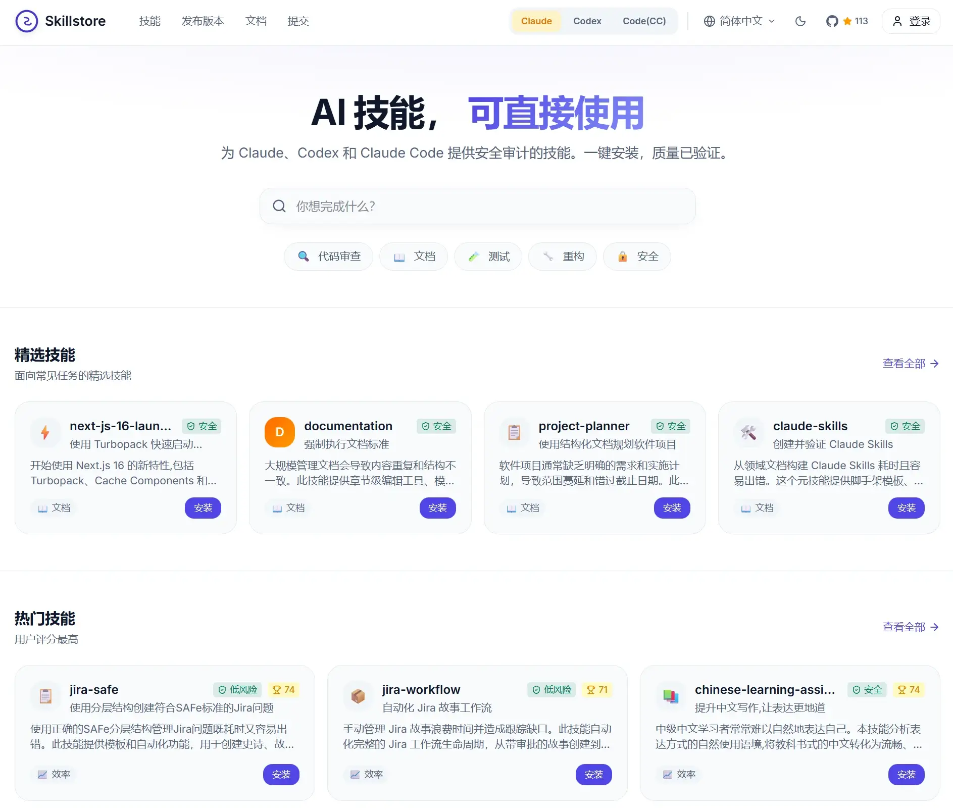 Skillstore 是一个 AI 技能商店,“为 Claude / Codex / Claude Code 提供可重用 AI skills 的开放市场”,目标是把常用能力打包成可一键安装、经过安全审计并可版本锁定的 skill,方便个人和团队扩展 AI 助手的能力。