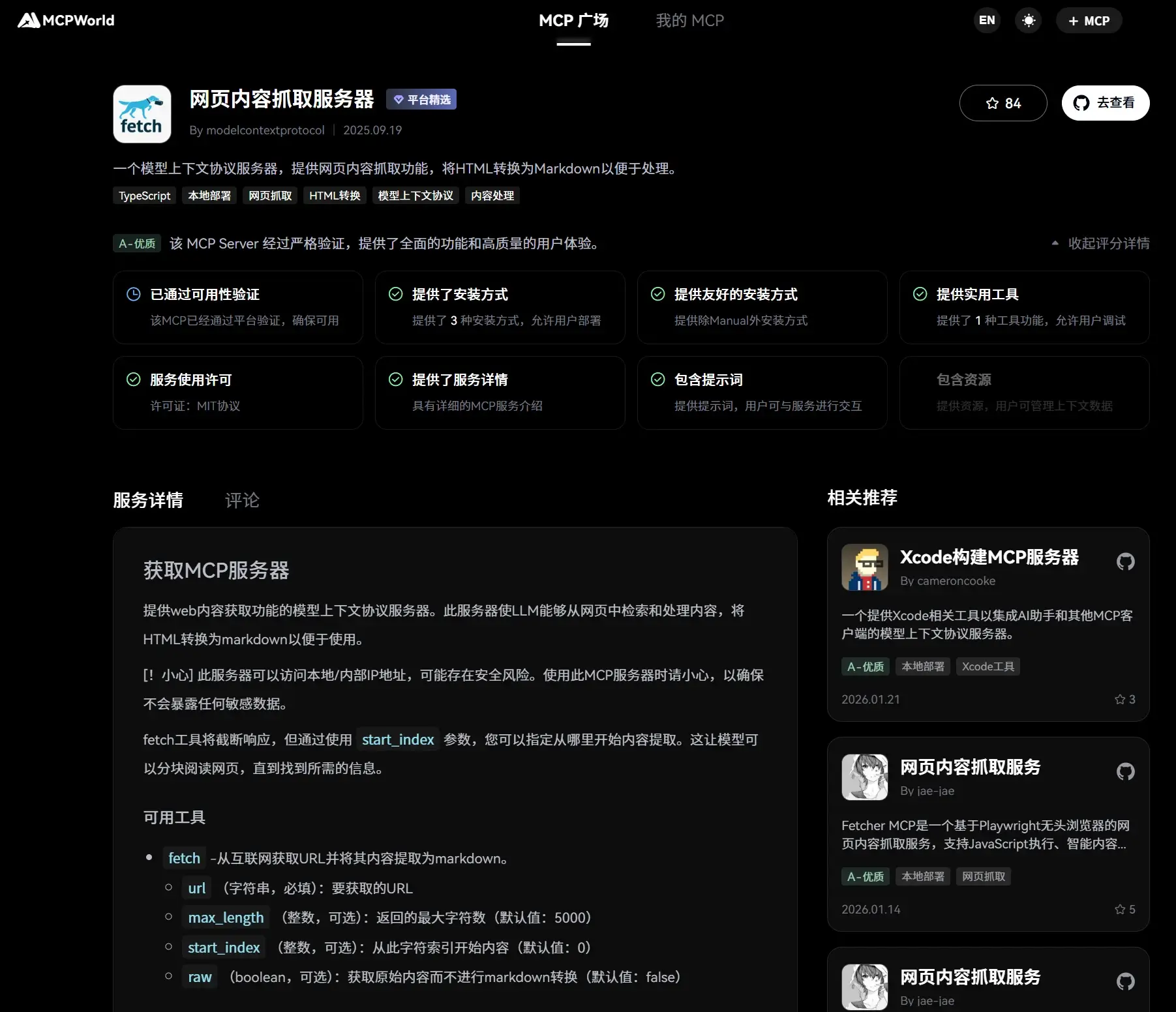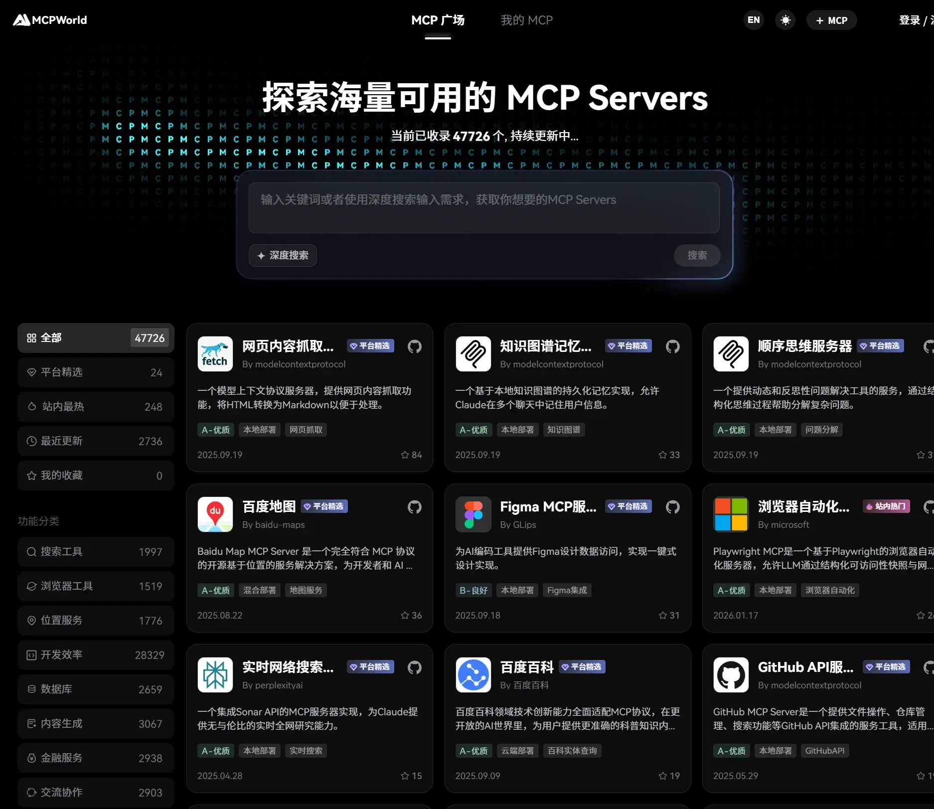 目前已经收录了当前已收录了47726个MCP Servers ,每个 Server/Tool 有说明、支持的 API、调用示例与访问端点,便于在 Host/Client 中快速接入。