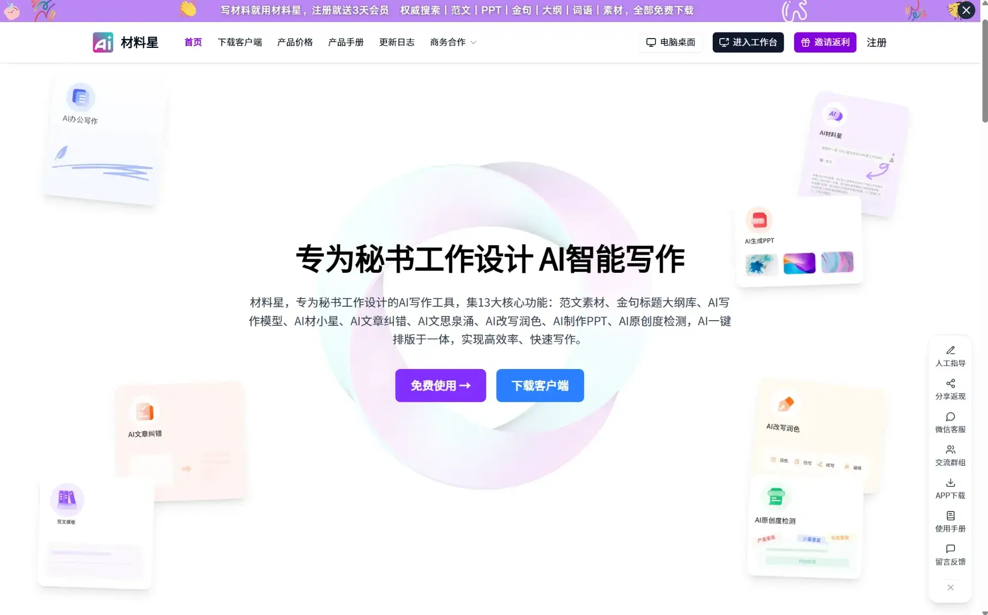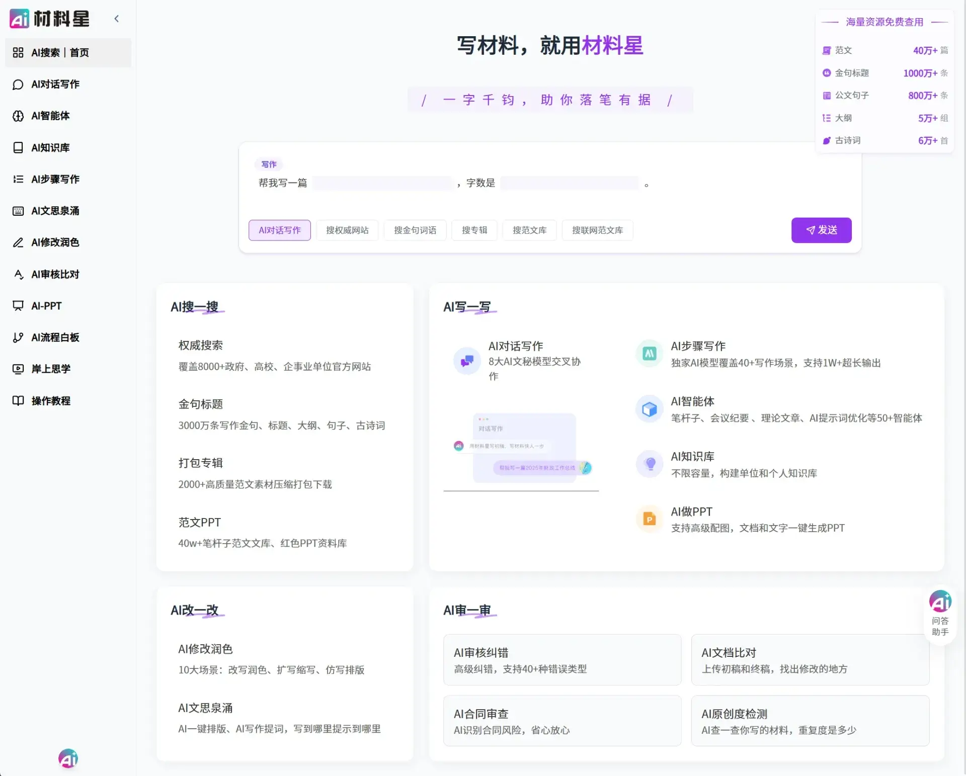 集13大核心功能:范文素材、金句标题大纲库、AI写作模型、AI知识库、AI对话写作、AI文章纠错、AI文思泉涌、AI改写润色、AI制作PPT、AI原创度检测,AI一键排版于一体,实现高效率、快速写作的公文写作辅助工具