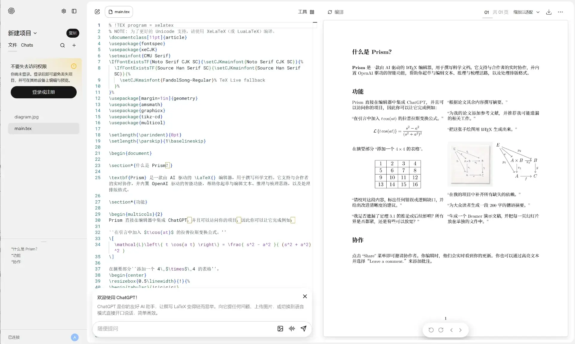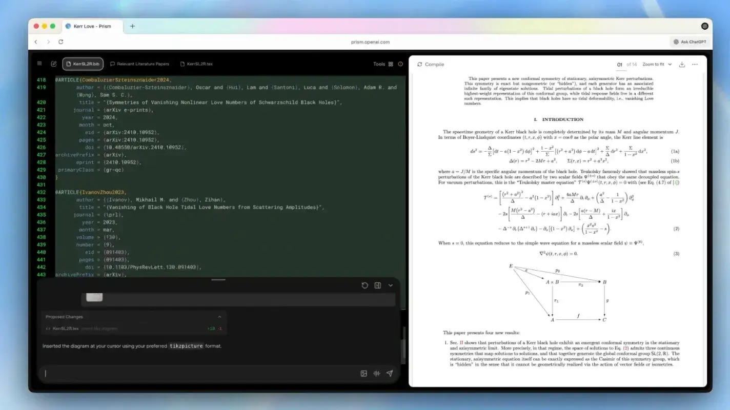 Prism 是 OpenAI 在 2026 年 1 月推出的AI 驱动的 LaTeX 编辑器,专为科研工作者设计,以 LaTeX 为核心编辑体验,内置基于 GPT-5.2 的编辑助手,目标是把论文撰写、引用管理、公式/图表处理和团队协作整合到一个平台中。
