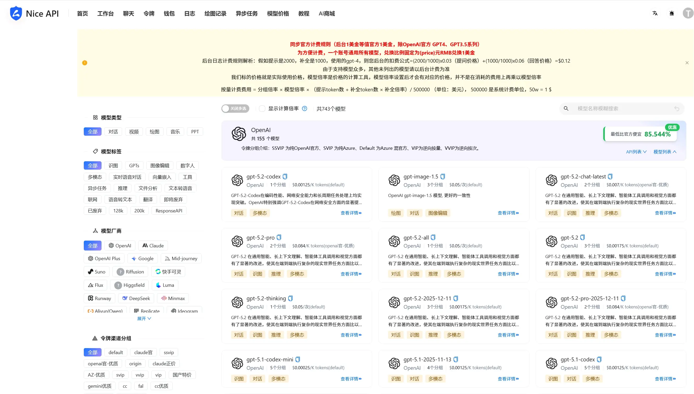 并且自称模型价格比官方的API最低便宜85%~