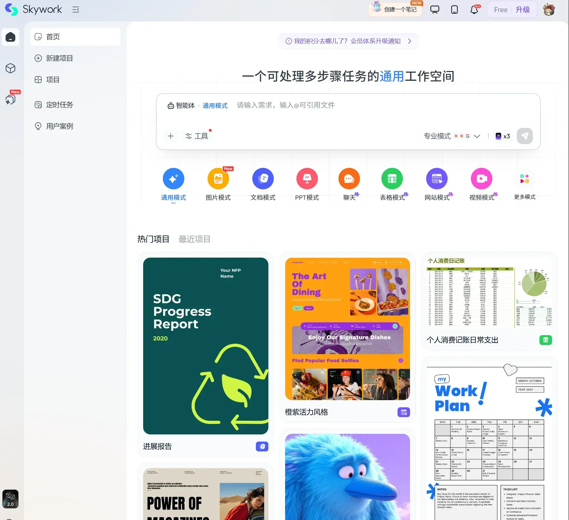 Skywork 是来自昆仑万维旗下的一款天工超级智能体,可以理解为“AI 办公智能体 + 深度研究(Deep Research)+ 多模态内容生成”的组合:你给一个主题/一句话需求,它不仅生成内容,还会去做更深的资料检索与整合,并把结果输出成你真正要交付的形态(文档、PPT、表格、网页等)