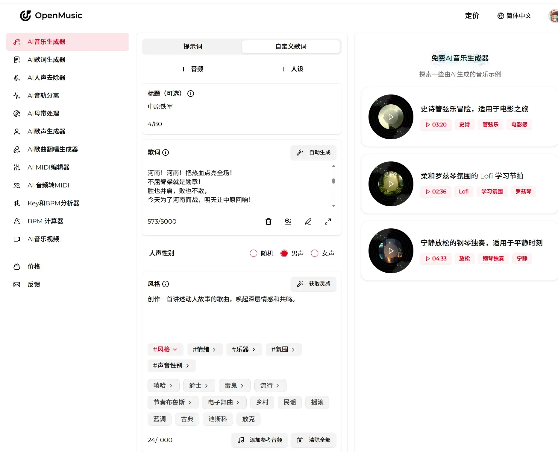 OpenMusic把复杂的音乐制作过程压缩成更容易上手的几个步骤:输入提示词或歌词,选择风格、情绪、乐器,再由系统生成完整音乐;如果你还想继续改,它又提供了人声分离、母带处理、MIDI、翻唱等后续工具。