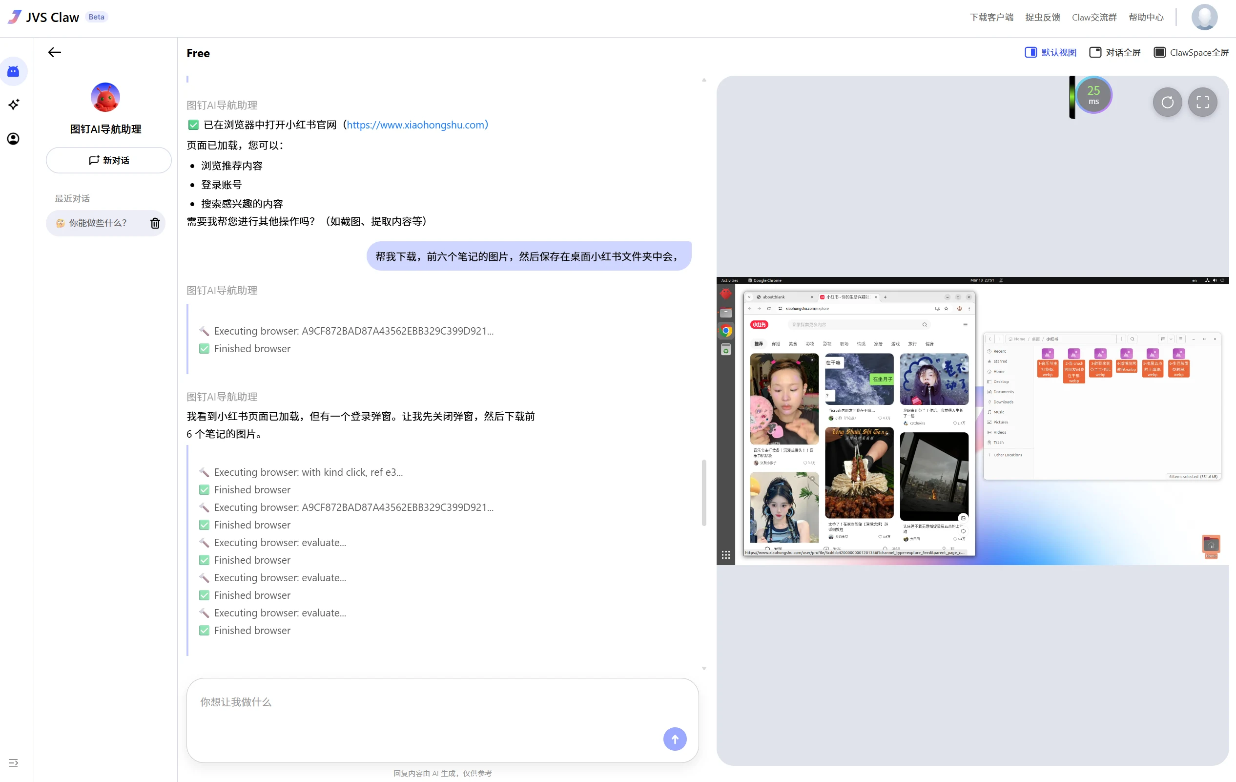 我这里让它帮我爬取小红书指定页面的图片,他就能自主的去小红书官网爬取,并帮我按照要求保存好。