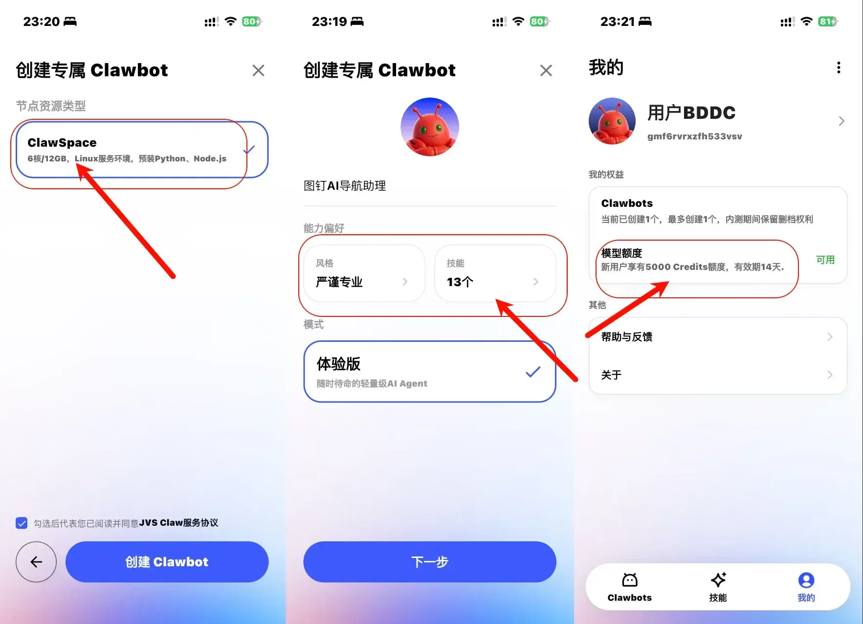Clawbot 可选择四种风格和内置13个skills 。新用户享受5000Credits的大模型额度,有效期14天。