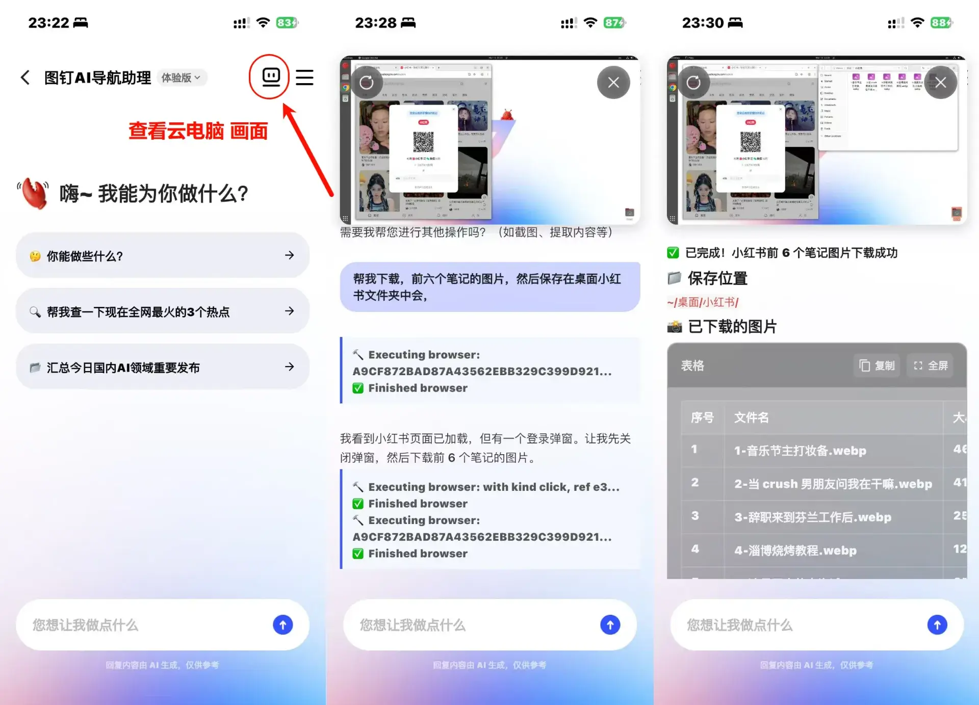 在对话页面,点击坐上角的小电脑图标,可以查看云电脑的画面。