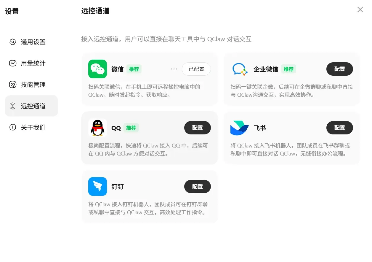 目前远程控制通道支持微信、QQ、企业微信、飞书、钉钉等多个平台。