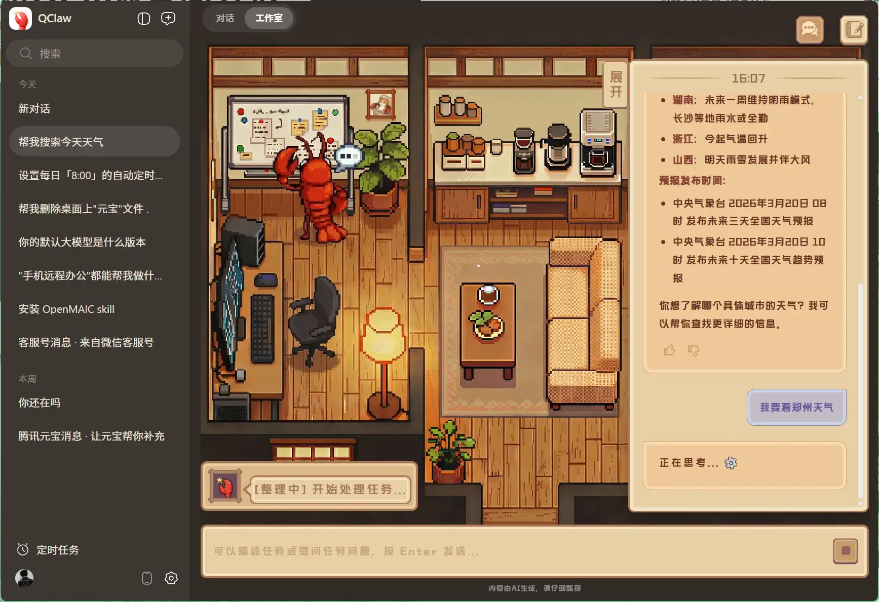 最新版的QClaw 还为龙虾设计了可视化UI,点击左上角一键切换工作室状态,宠物龙状态一目了然,还能直接在这页面与它对话。像素画的风格还挺可爱,后续如果真的能在这里“养宠物”就好玩了。