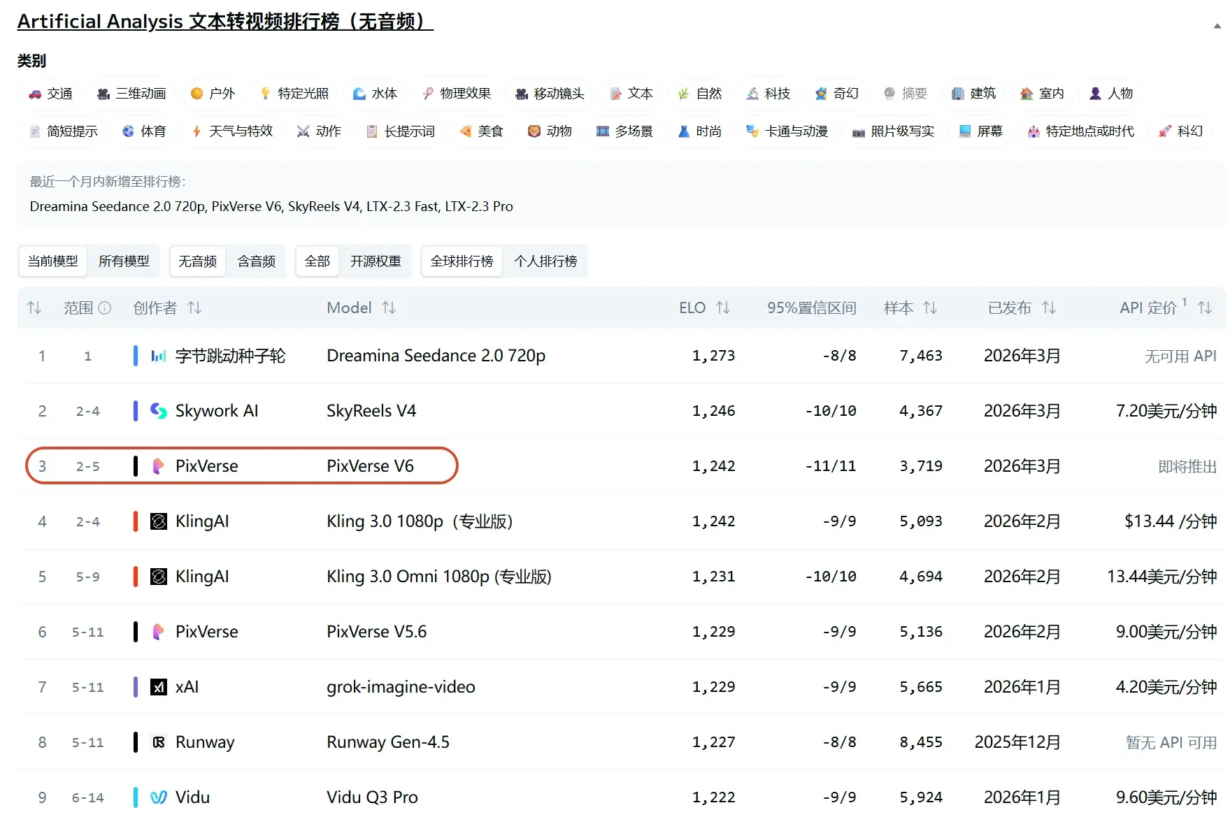 目前PixVerse V6在Artificial Analysis的全球文生视频排行榜上排列第三名,前几名的差别都不大。这成绩在国产AI工具里算是相当能打了。
