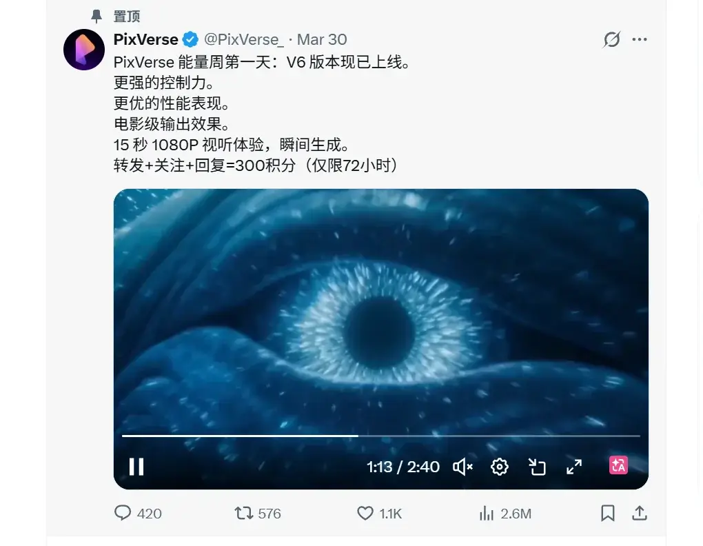 2026年3月31日 PixVerse 上线了他们的最新大模型 PixVerse V6 ,V6生成时长最长可达 15s,在人物真实感、复杂运动、物理模拟与声画协同等方面全面升级。