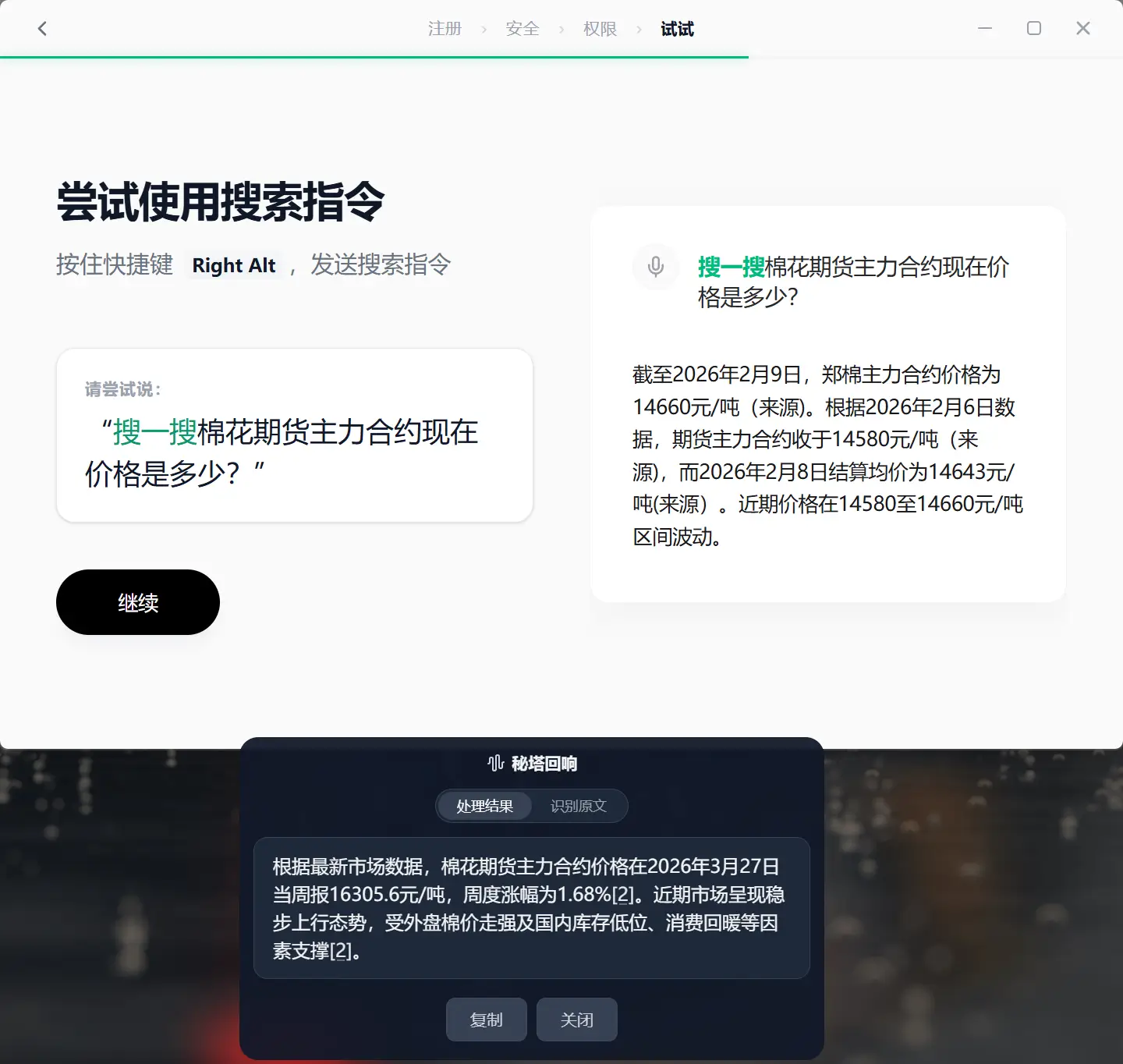 作为AI输入法,还有个我觉得挺实用的功能,就是边说边下指令。比如你对着它说“搜一搜 棉花期货主力合约现在价格是多少?”那就能直接为你搜索,并反馈结果,不再需要你打开浏览器,搜索了。