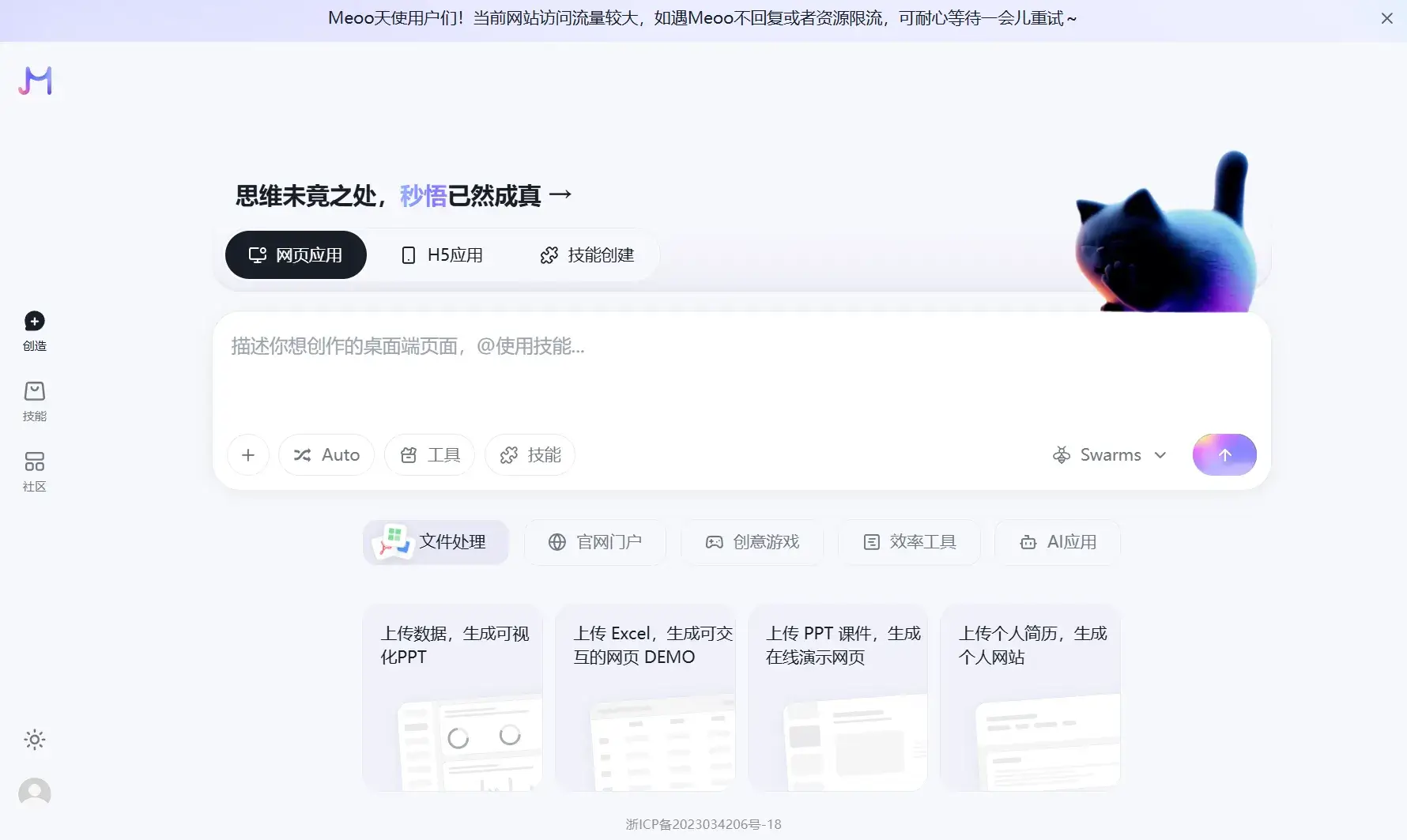 除了核心的网页应用生成能力,你还可以使用它进行H5页面制作、技能创建、文件转网页等能力。