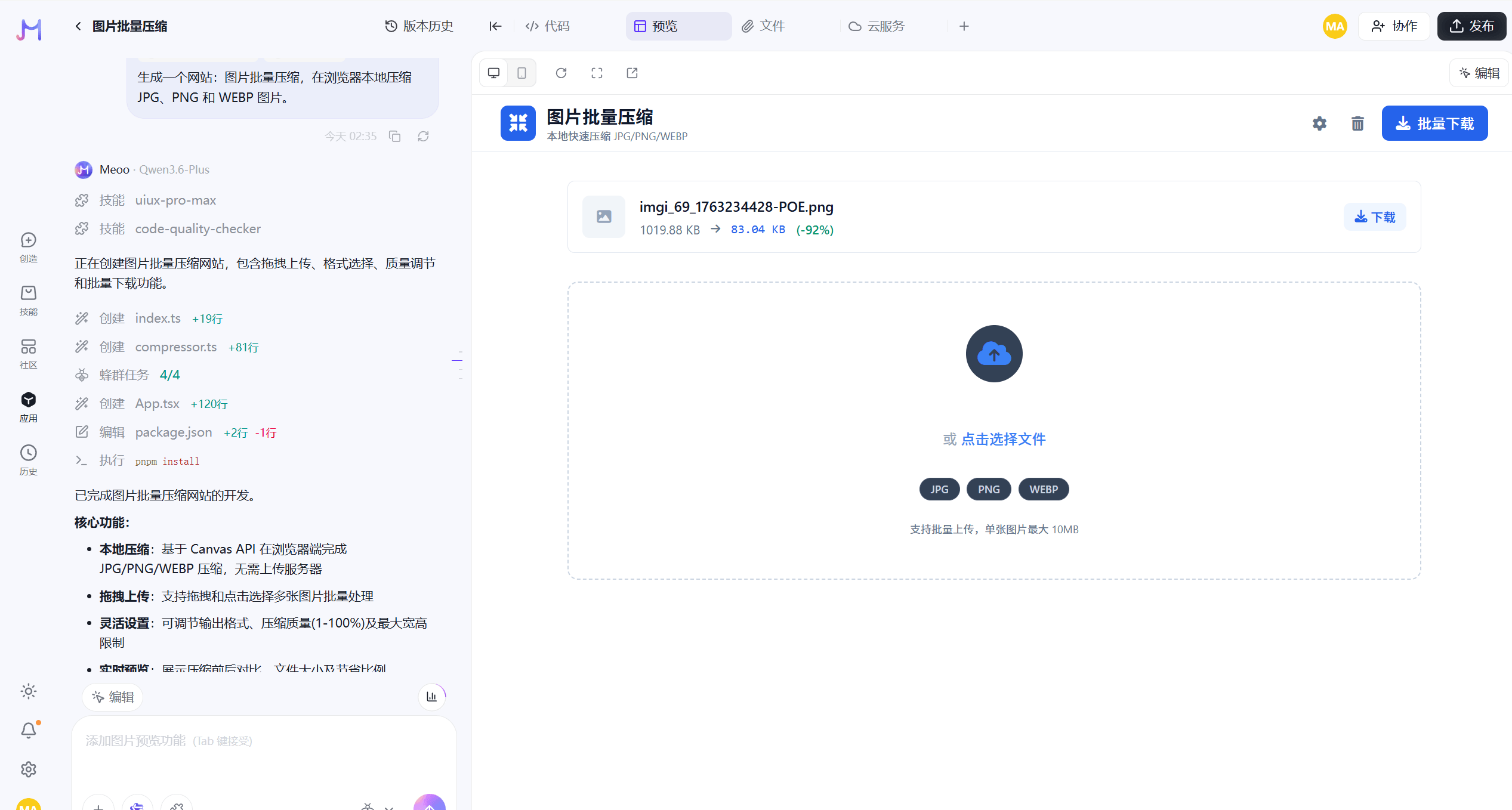 我让他帮我生成一个图片批量压缩的工具网站,一两分钟就搞定了,速度真的是太快了。