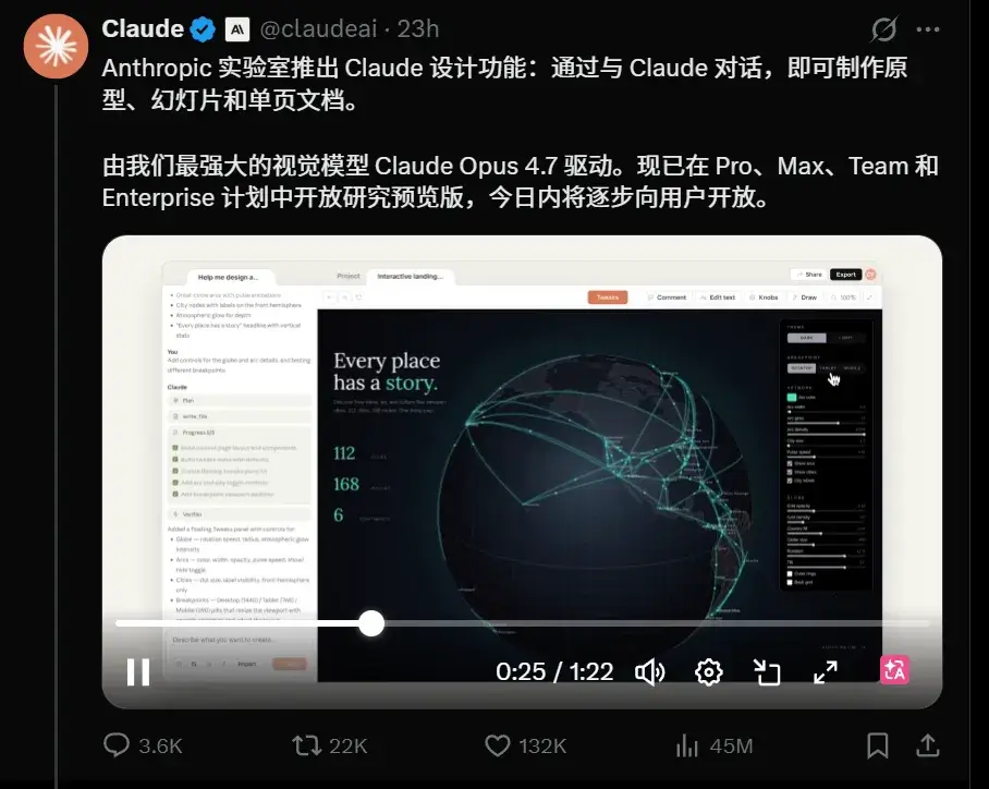Claude Design 是 Anthropic 刚推出的一款 AI 设计工具,你用自然语言描述想法,它就能帮你生成原型、幻灯片、单页稿这些视觉内容,比较适合想快速把点子做出来的人。