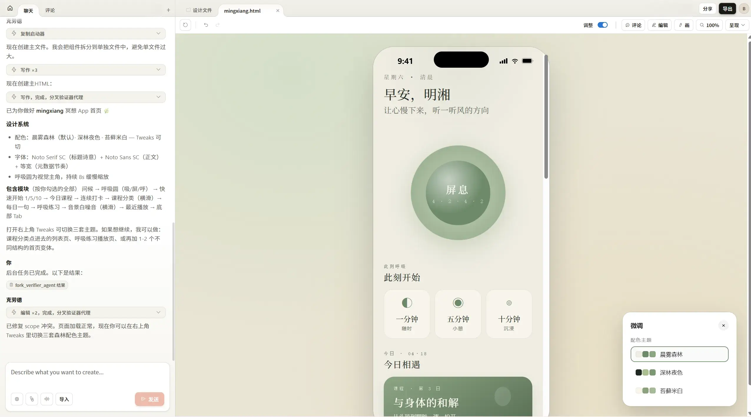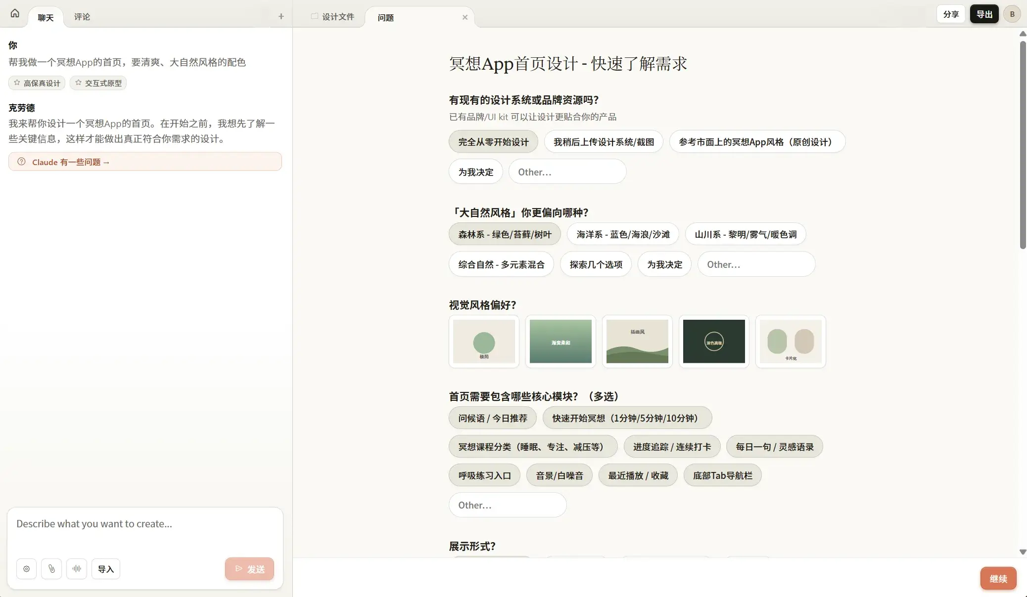 你直接用大白话描述想要啥,它就能给你生成初版设计。比如“帮我做一个冥想App的首页,要清爽、大自然风格的配色”,几分钟就能看到成品。