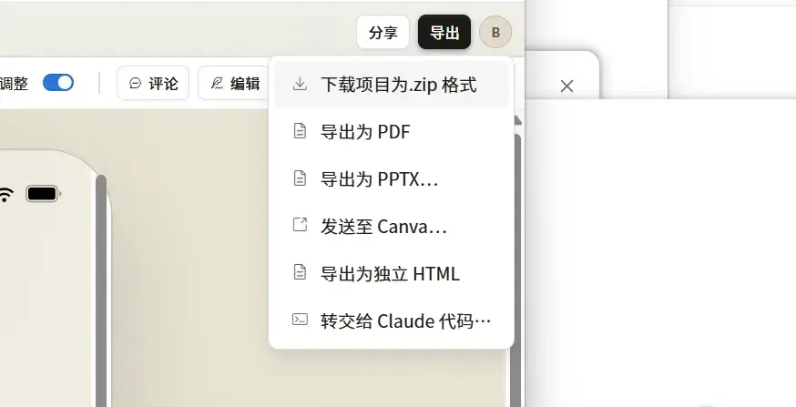 支持导出 PDF、PPTX、HTML,还可以直接发到 Canva 继续编辑。