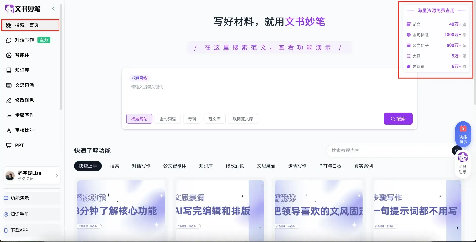 1,40W+范文、词语、金句、大纲、权威搜索、联网范文搜索全部免费使用,课程、教程、AI提示词免费使用学习。
